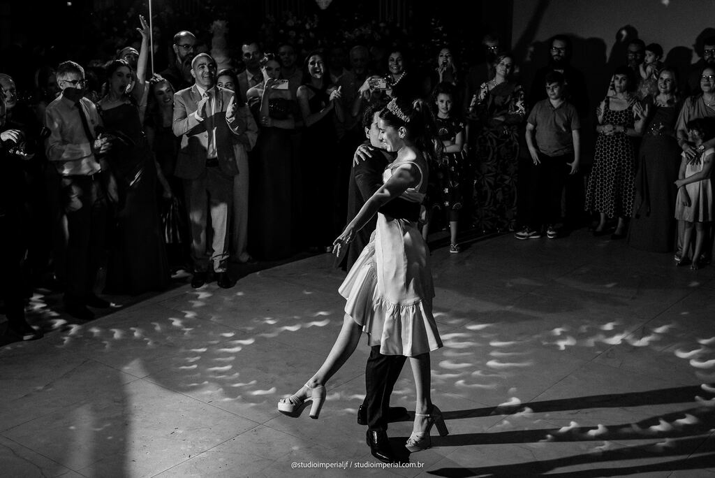 Mais a nossa cara, impossível. Para a nossa dança, eu troquei meu vestido de noiva por um vestido midi feito sob medida.