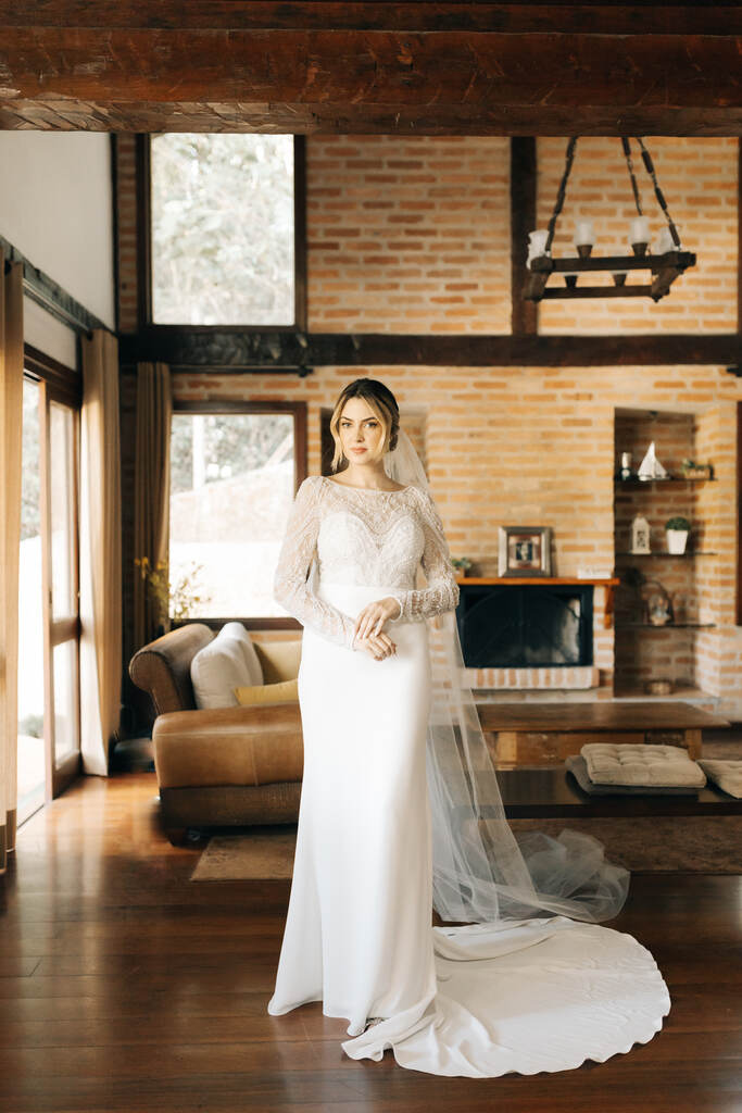 Esse modelo equilibra uma saia totalmente simples, apenas com uma cauda discreta com bordado ricos em detalhes na parte de cima.