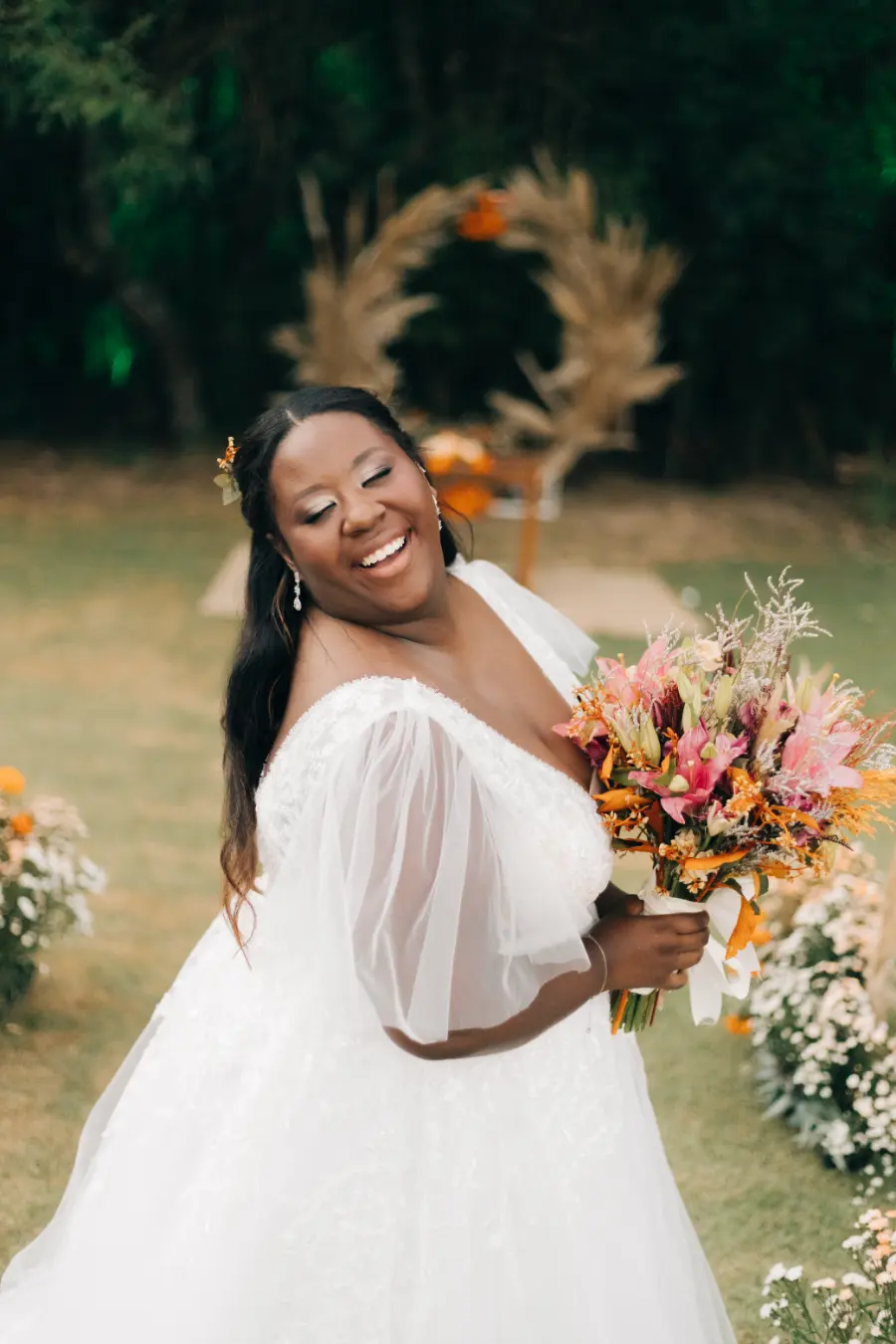 noiva plus size com buque colorido