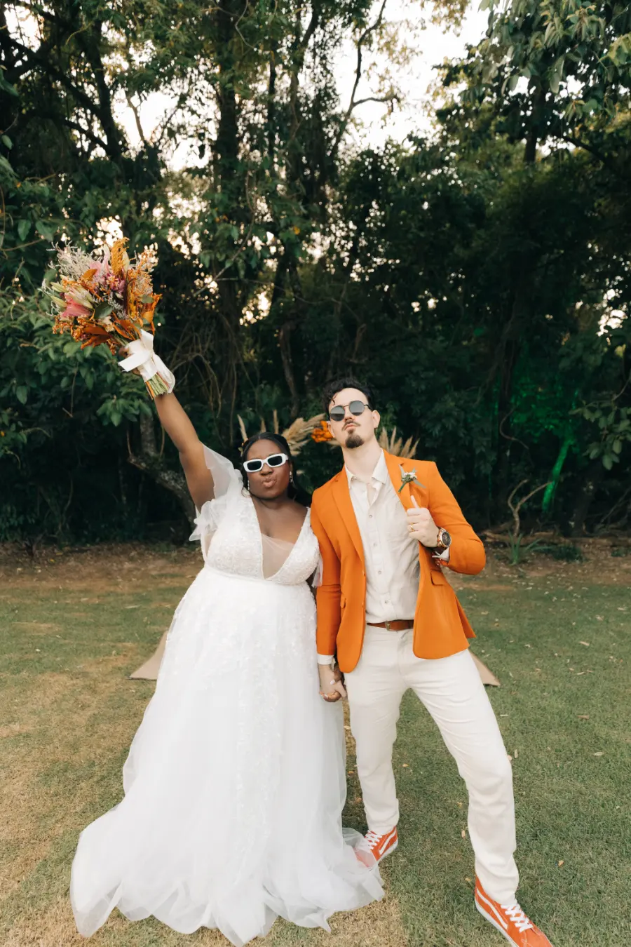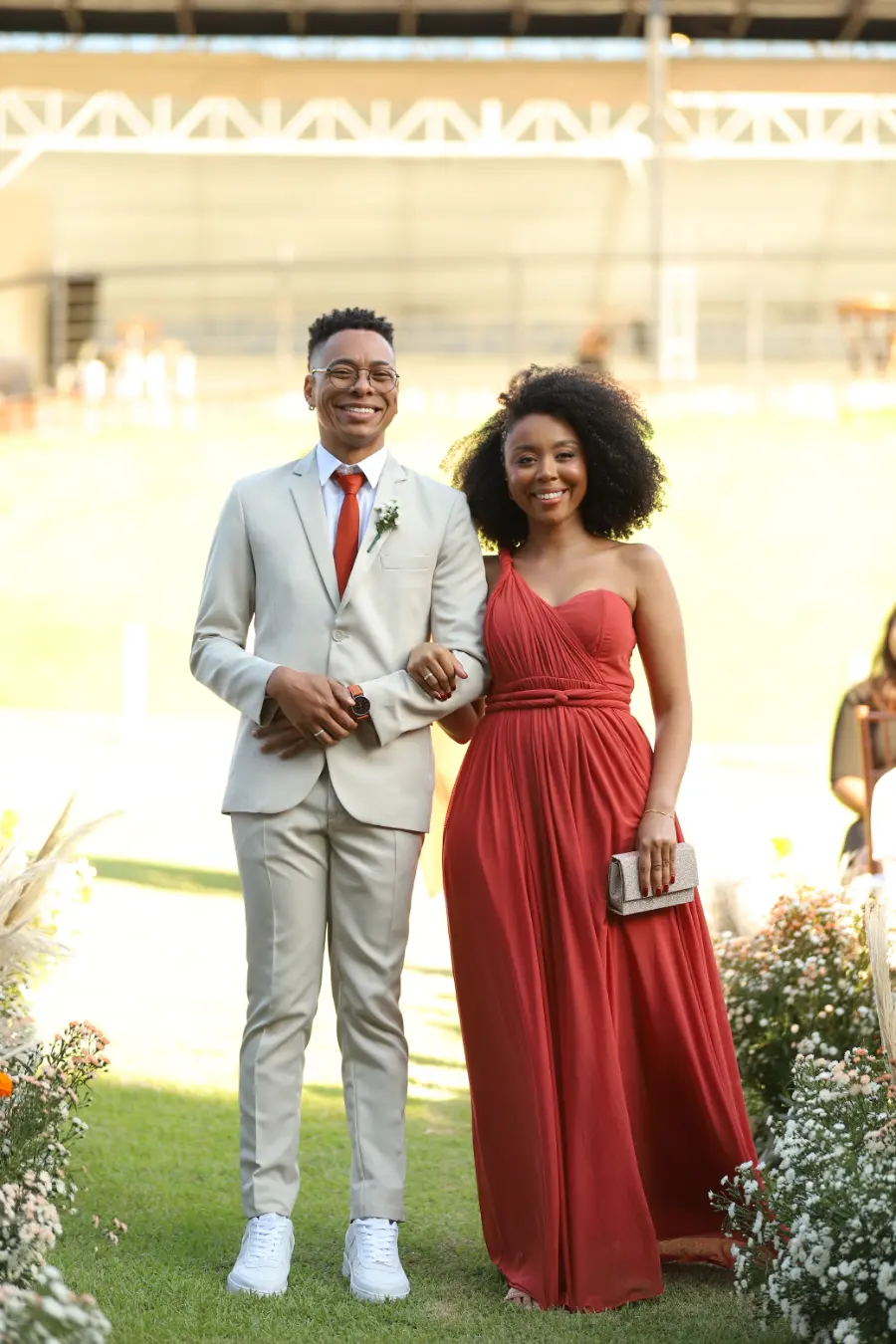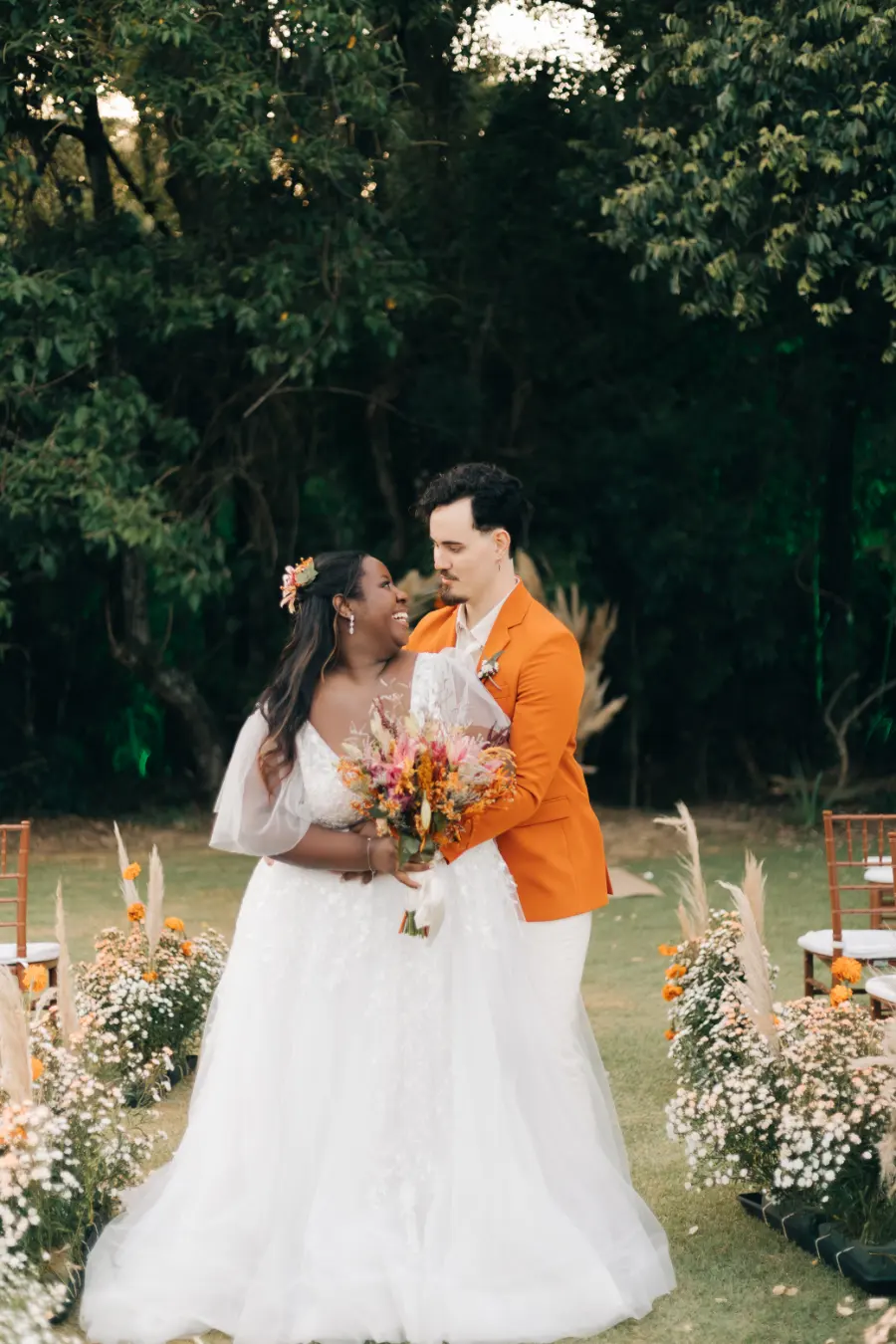 Noivo surpreende com terno terracota em casamento boho chic