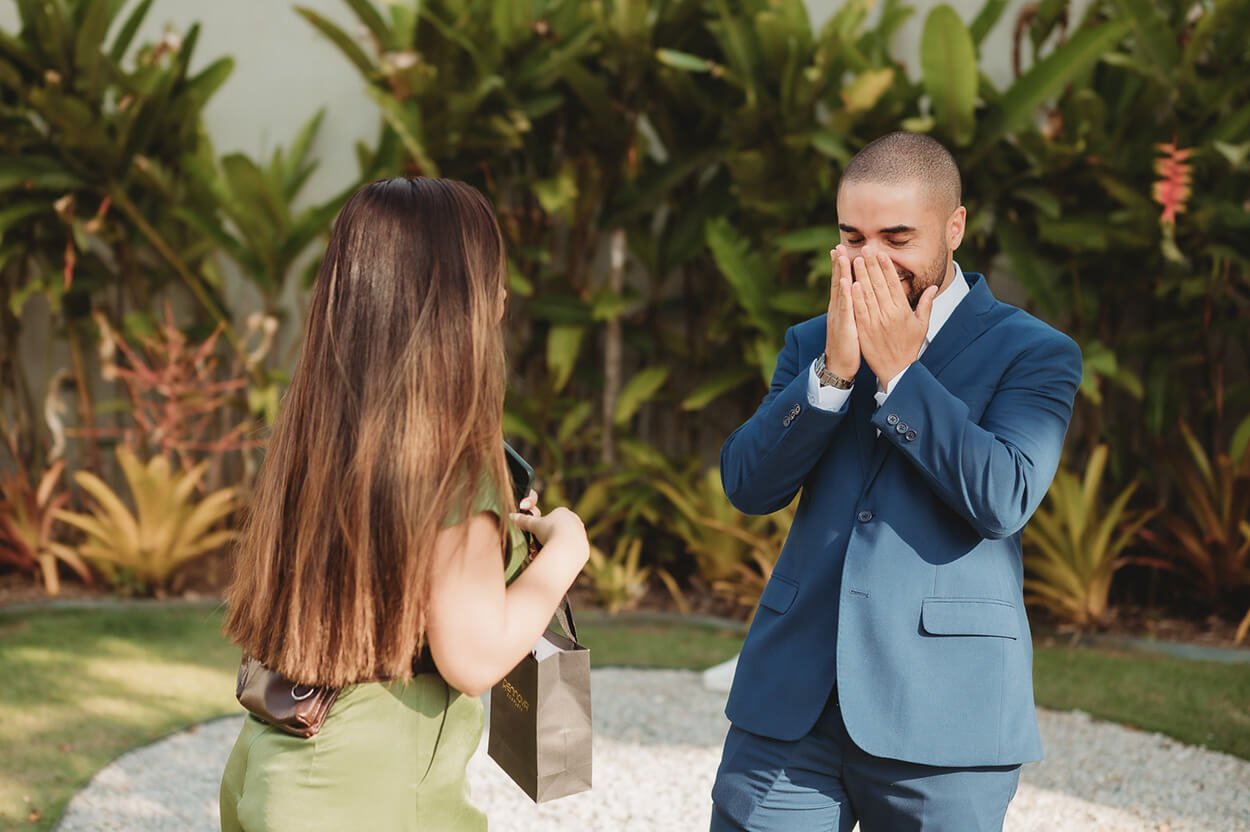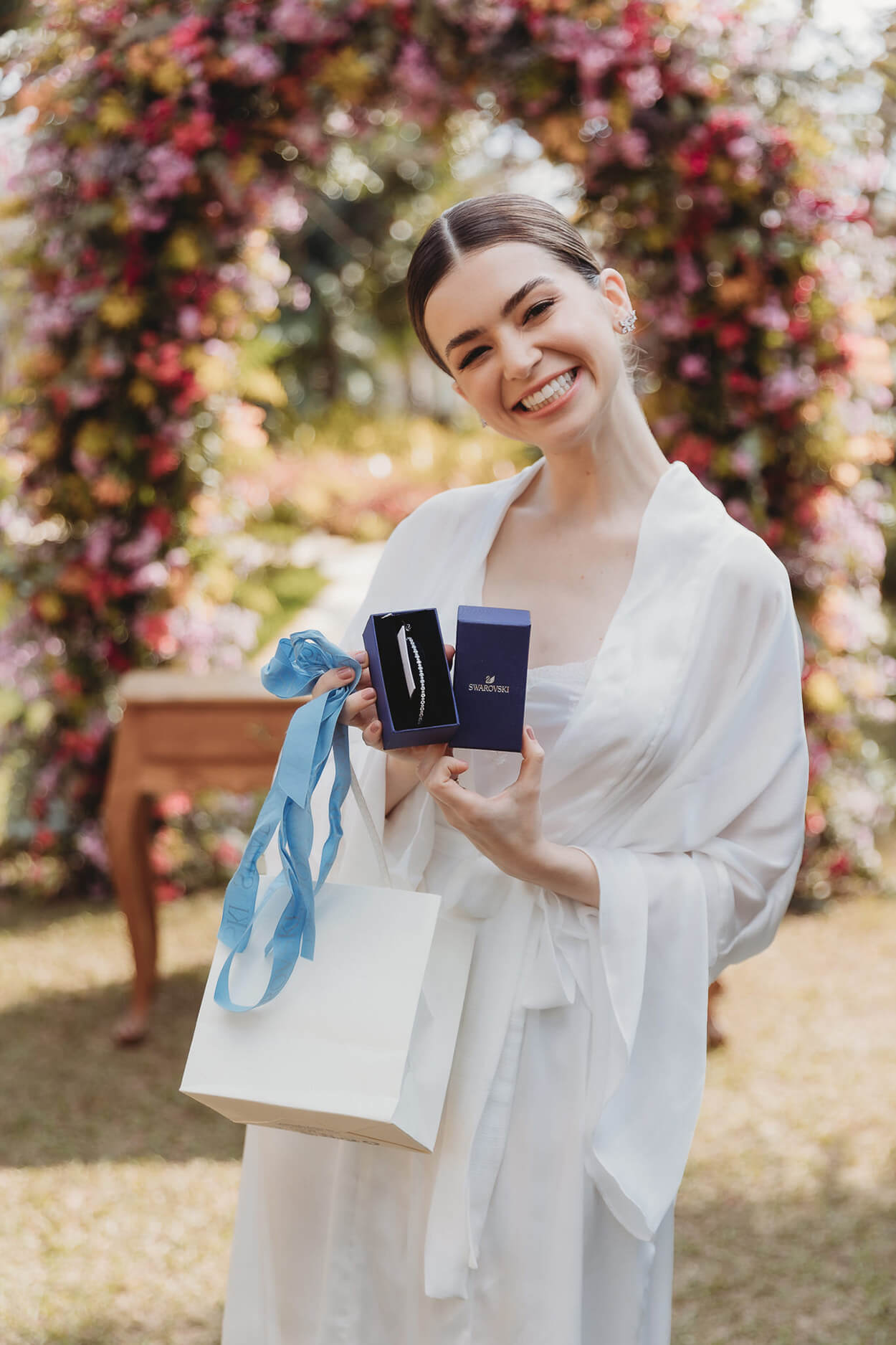 Nem todos os casais querem reservar um tempo para um ensaio first look ou first touch, mesmo assim, ainda dá para ter um momento super bacana entre os dois. Basta fazer como a Cacau e o Alexandre, que trocaram presentes enquanto se arrumavam.