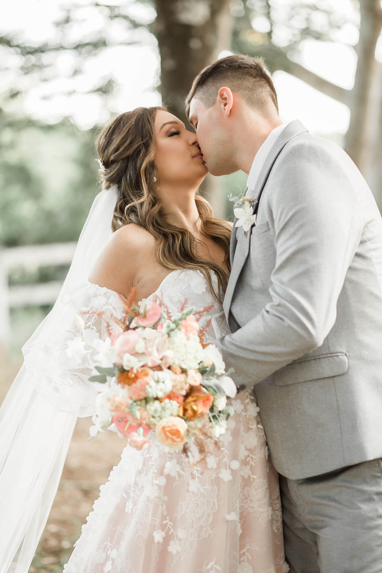 Como não fizeram um ensaio first look ou first touch, o casal reservou um momento após a igreja para registrar essas cenas apaixonantes na calmaria do campo.