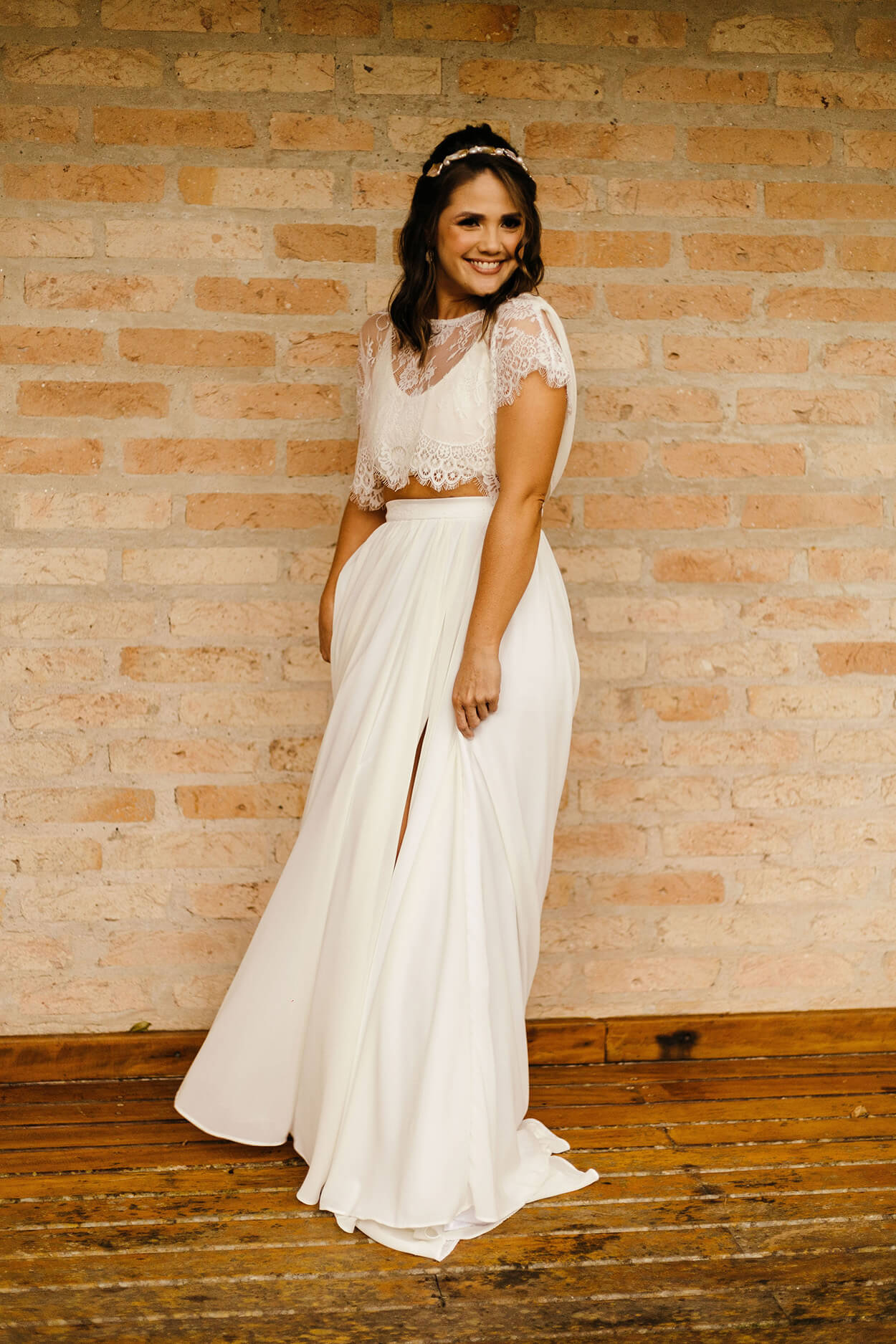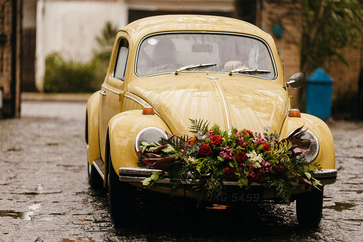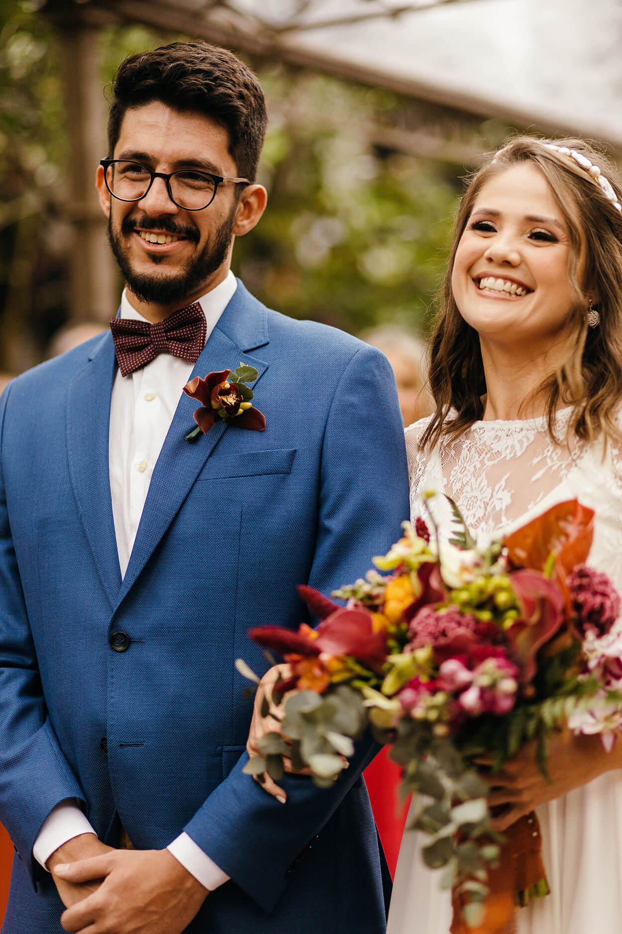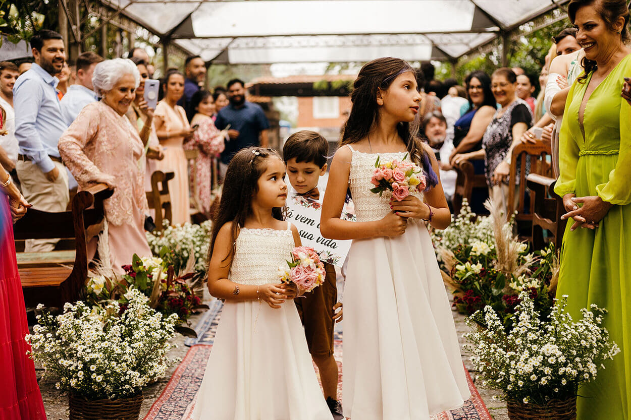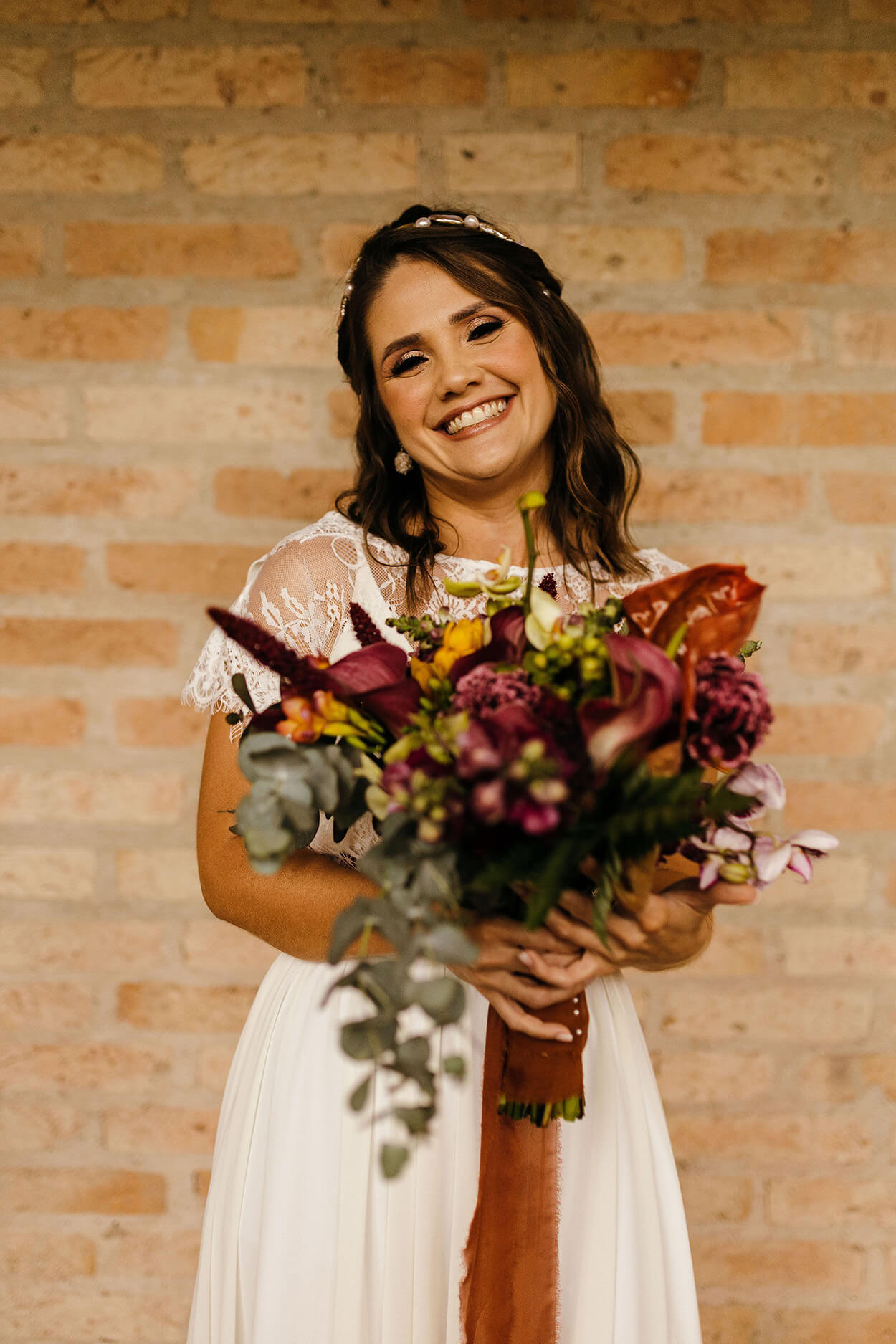A primeira coisa que chama a nossa atenção no visual da Tallita é seu estilo natural e descontraído. Somente uma noiva cheia de personalidade e bem decidida escolheria um cropped para arrasar no grande dia. O buquê é envolto em um tecido marrom, cor que a conecta com os padrinhos e seu noivo.