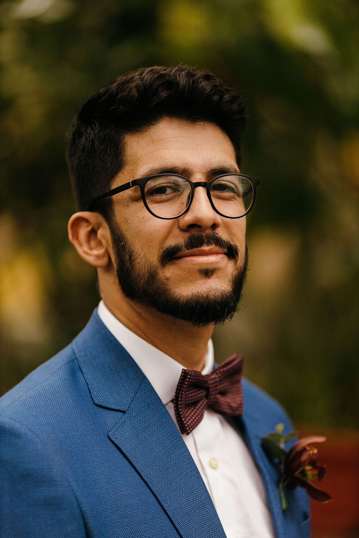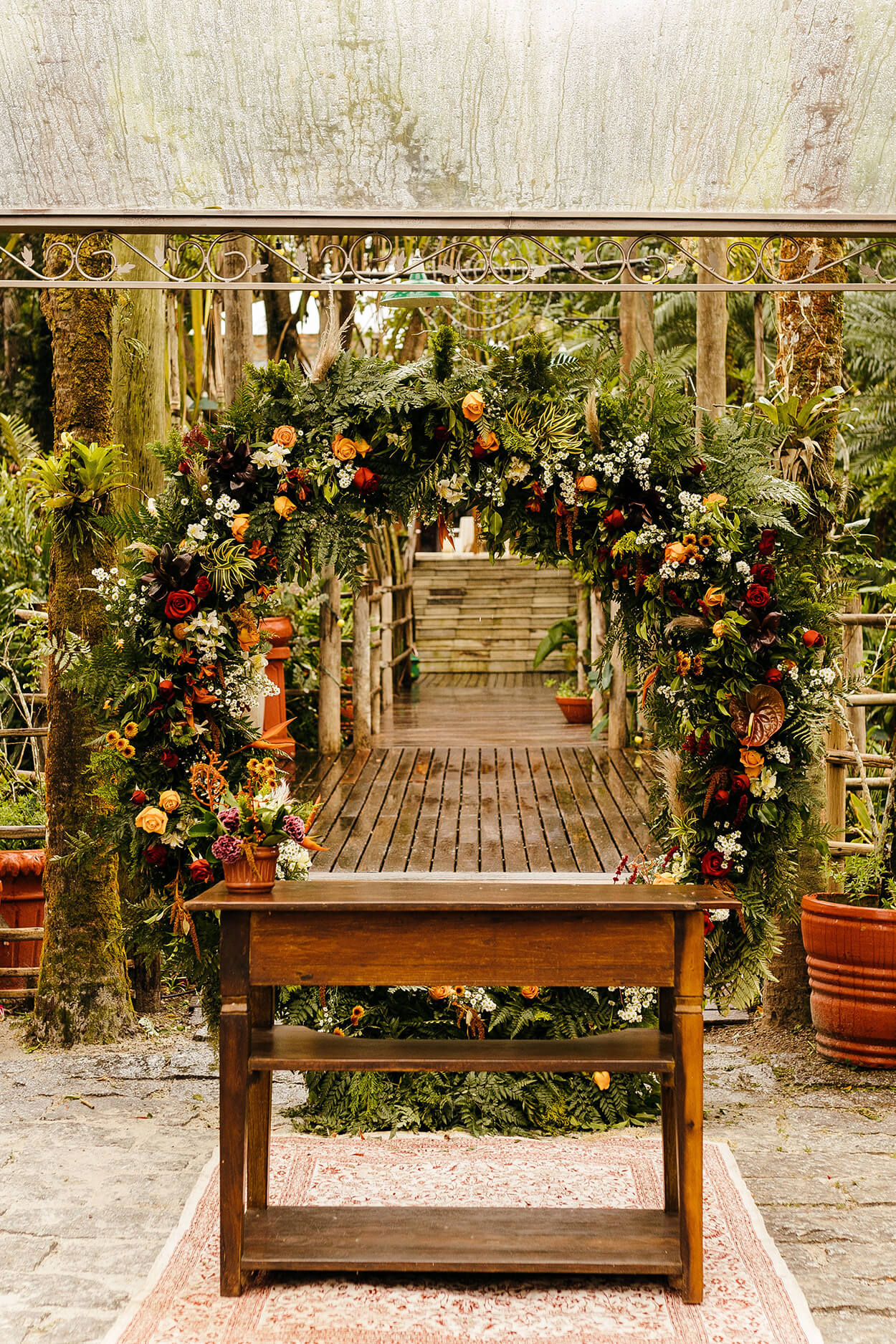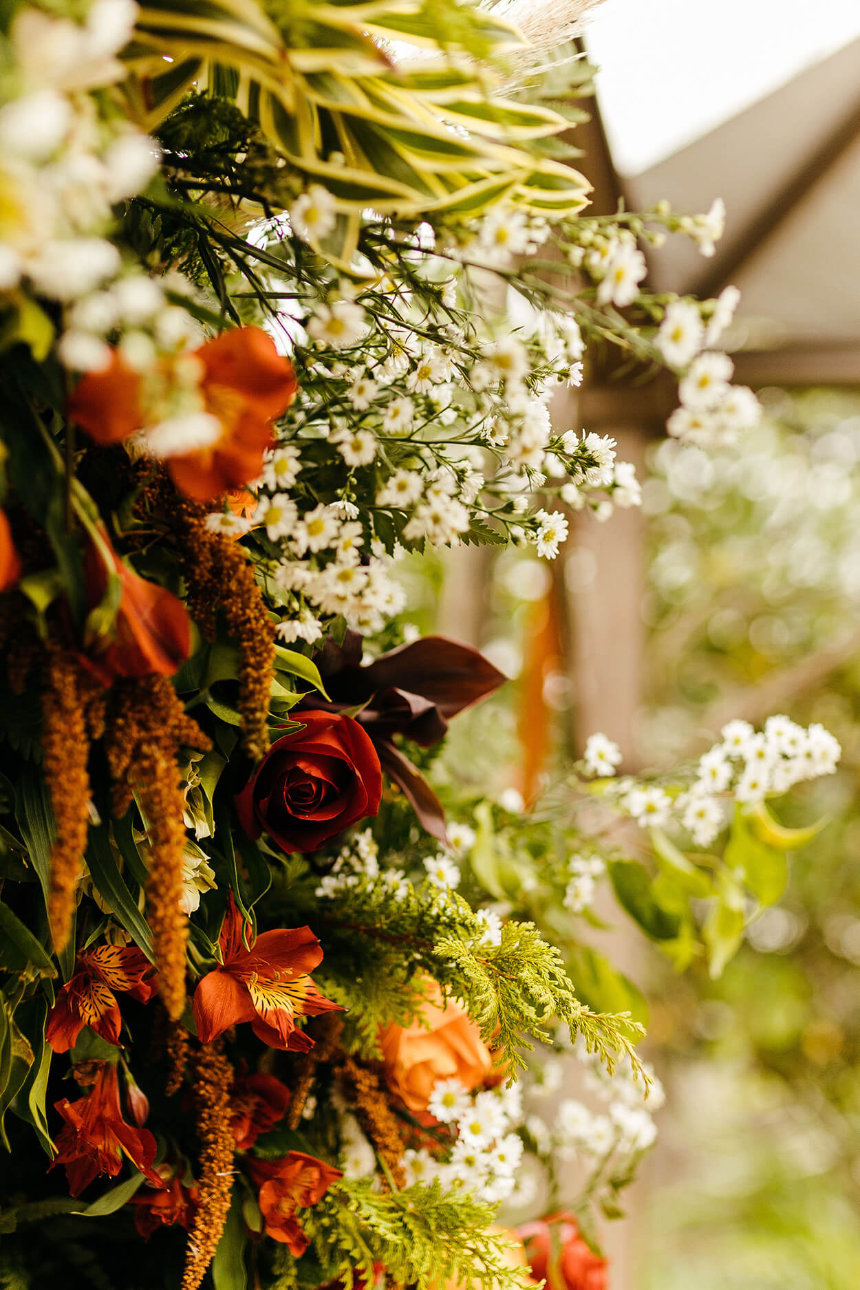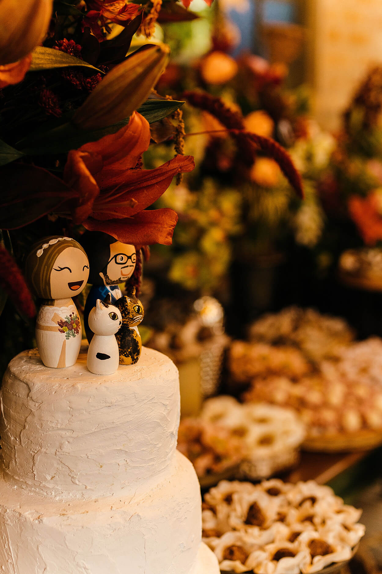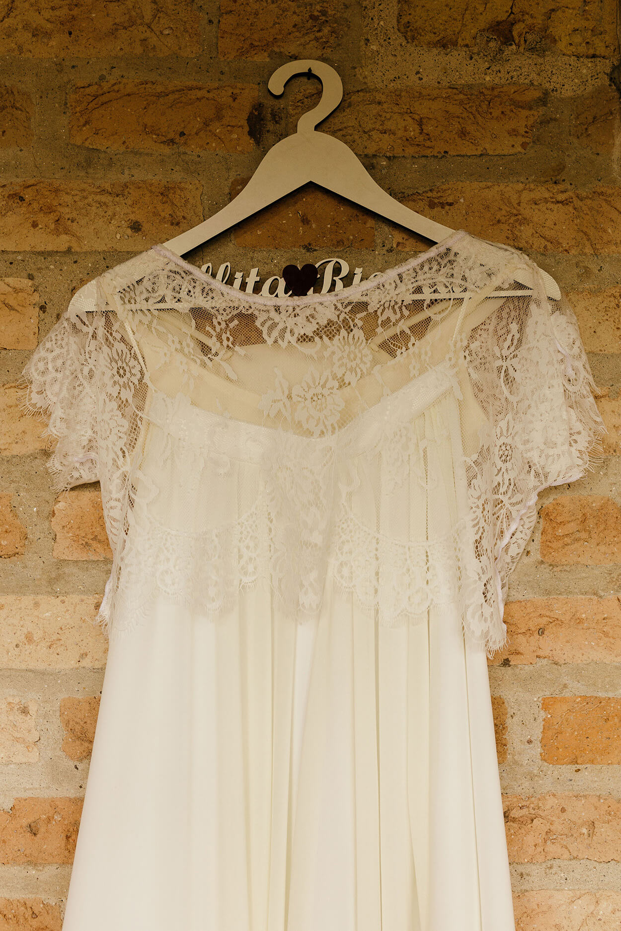 A primeira coisa que chama a nossa atenção no visual da Tallita é seu estilo natural e descontraído. Somente uma noiva cheia de personalidade e bem decidida escolheria um cropped para arrasar no grande dia. O buquê é envolto em um tecido marrom, cor que a conecta com os padrinhos e seu noivo.