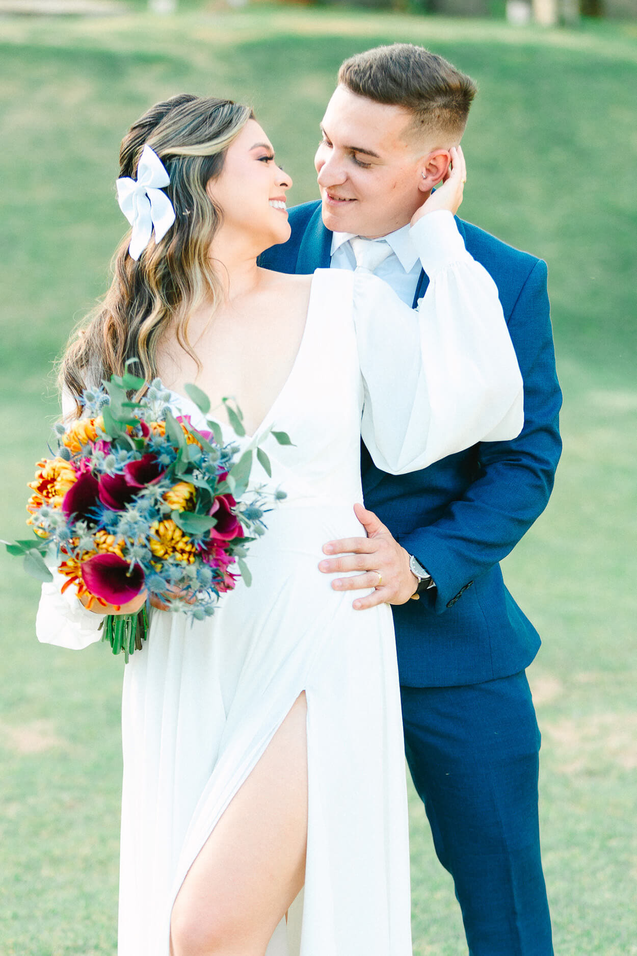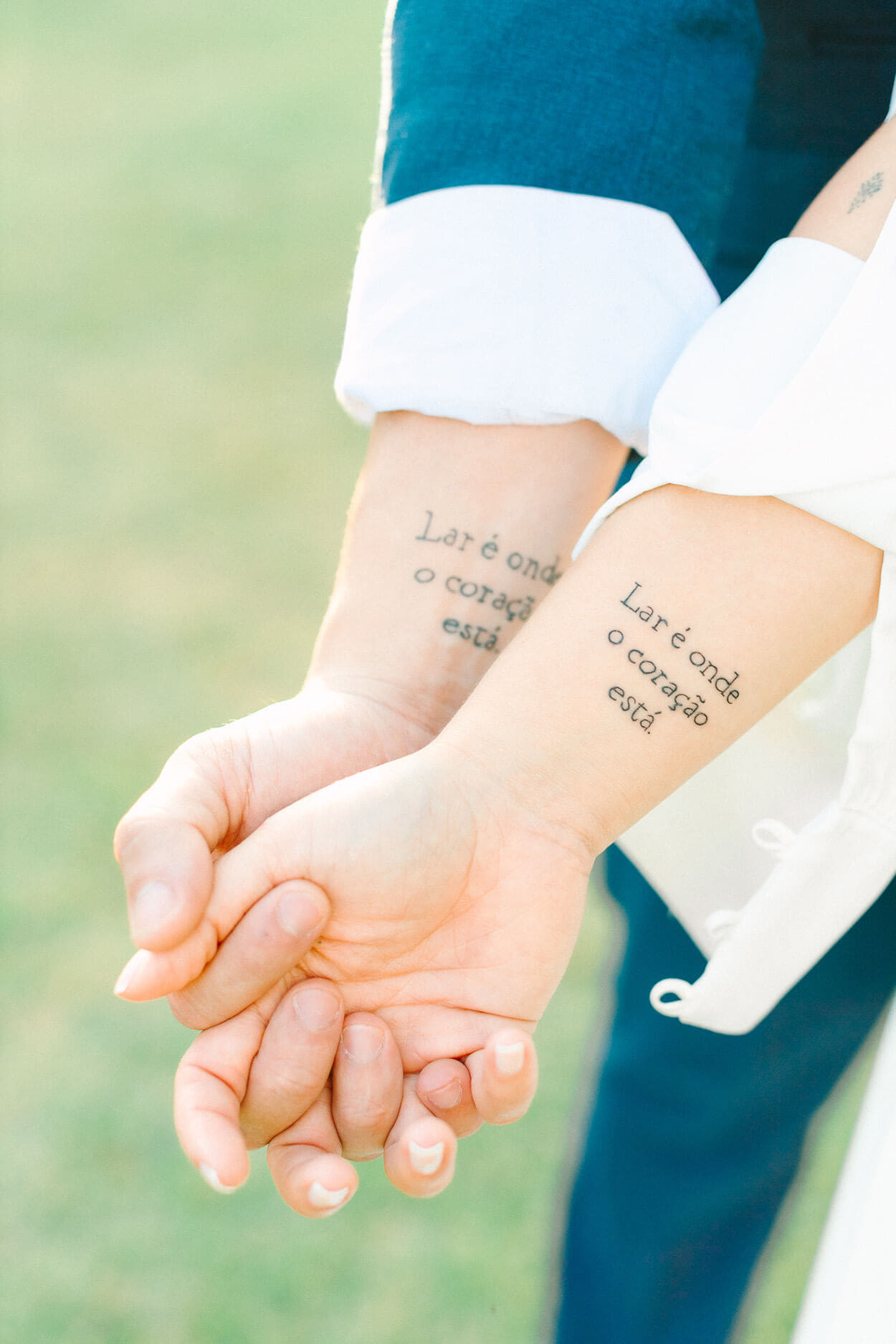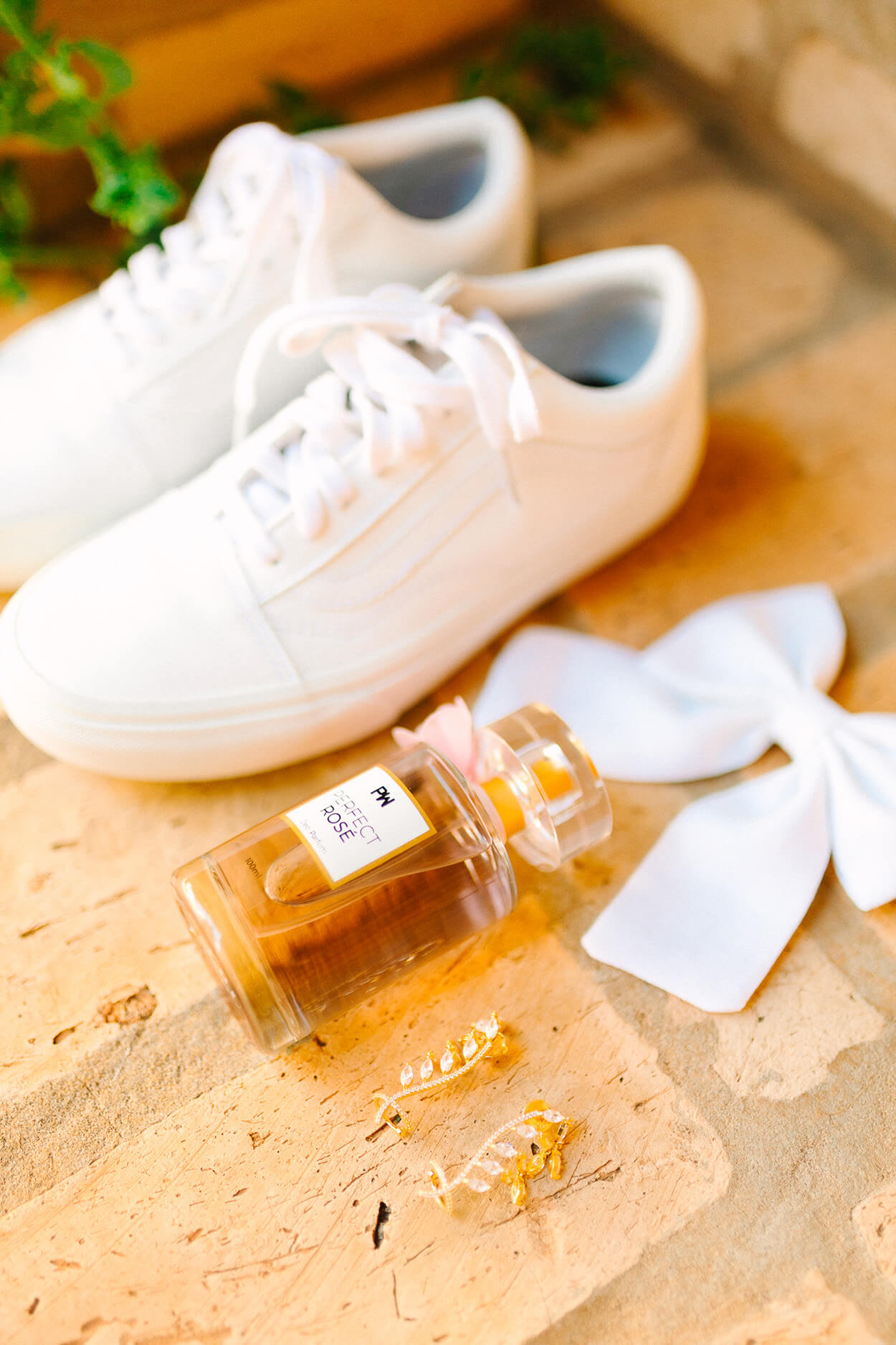 Aqui vai uma dica: nunca subestime o poder de um acessório! O casamento passaria uma impressão diferente caso os noivos tivessem escolhidos calçados tradicionais. Repare como o visual do noivo fica bem mais leve só por contar com tênis casual. Já para a noiva, o look fica mais moderninho e poderia ser usado até em um casamento na cidade.