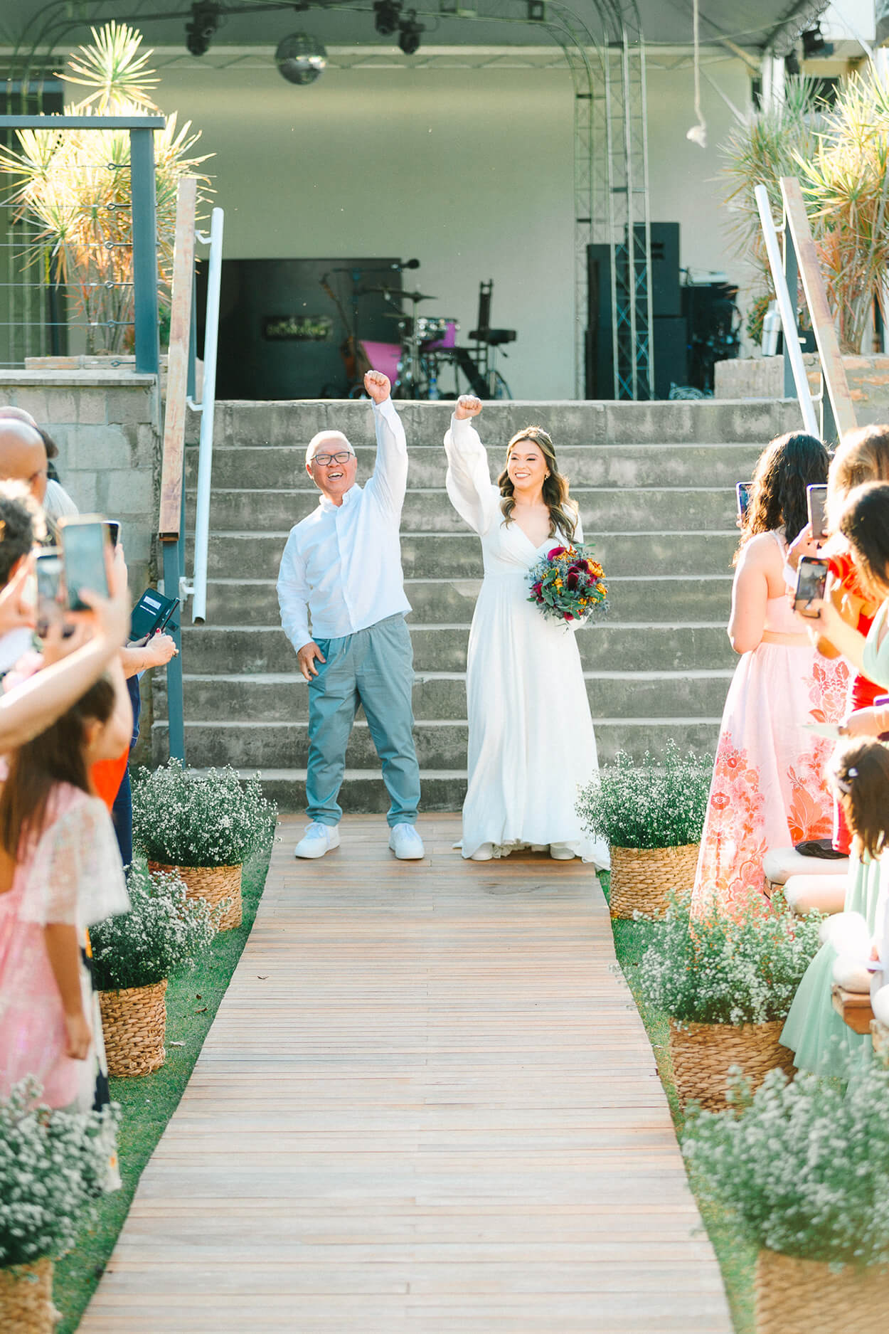 A cor e o torcidinho formaram a dupla perfeita. Outro detalhe bacana é que o pai da noiva fez uma entrada bem animada ao lado da filha. E se você tem um olhar atento, já reparou que o pai da noiva também está de tênis, haha.
