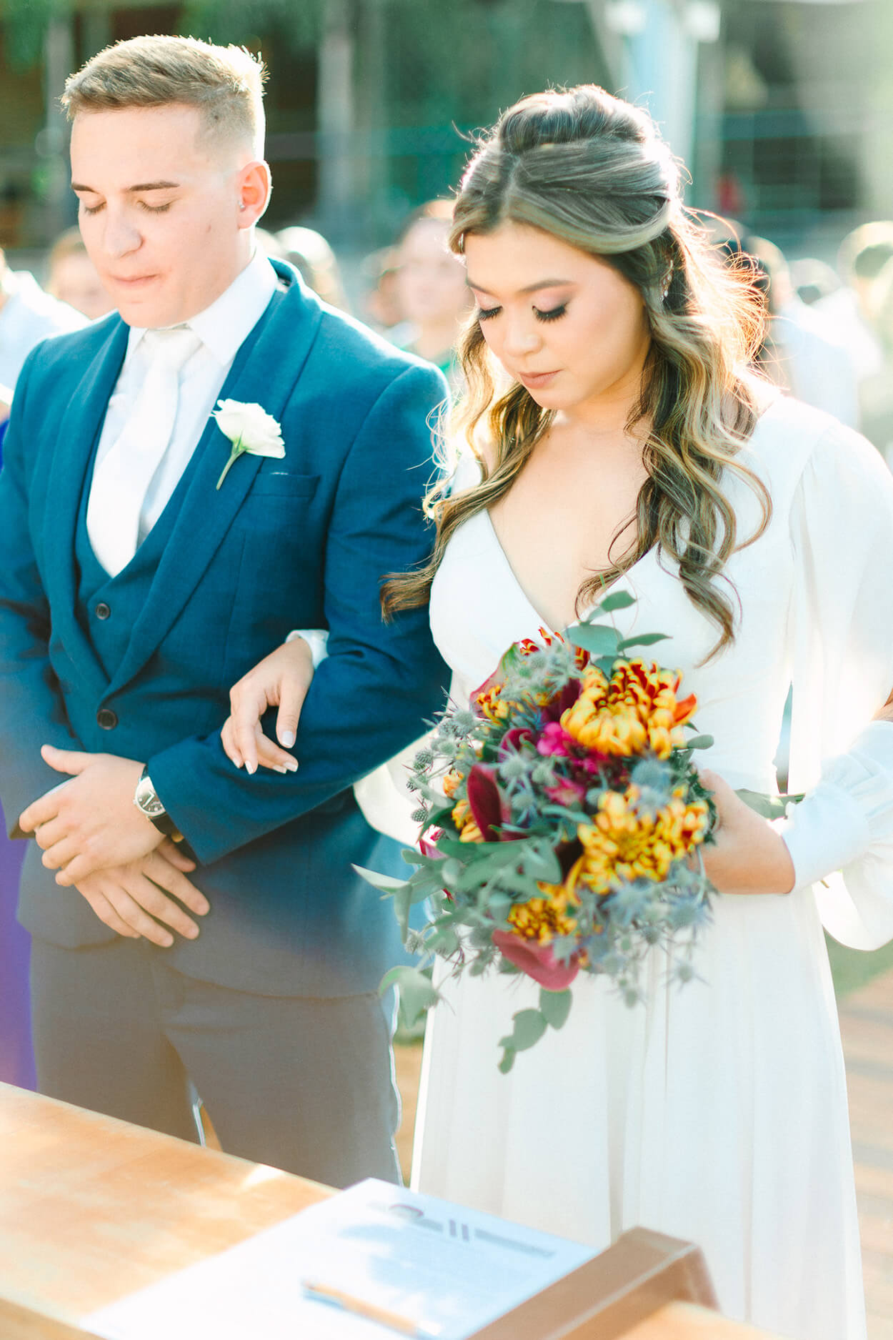 Pode não parecer, mas o rústico também tem seu lado versátil. Afinal, é possível encontrar inspirações com uma pegada romântica, boho, greenery e também simples, como esse casamento aqui. A beleza está na harmonia da paleta com esse toque de cores quentes presente tanto nos arranjos, quanto no buquê.