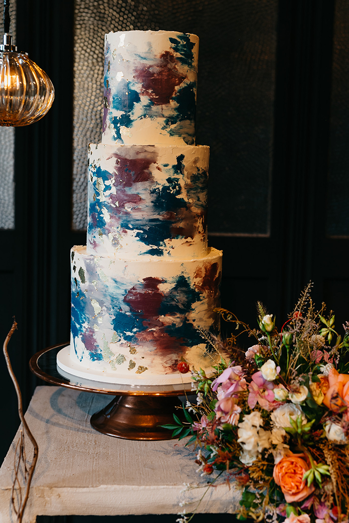 O bolo criado pela Baking Dreams, destaque principal e absoluto da mesa, tinha que ter muita presença e personalidade para integrar perfeitamente o cenário atemporal e apaixonante! Por isso, ele foi montado numa estrutura de 3 andares, altos e imponentes, com uma cobertura deliciosa de ganache belga branca, espatulada manualmente, nos tons da paleta de cores do editorial, e fizeram um par perfeito, com o cenário aquarelado da mesa dos noivos.