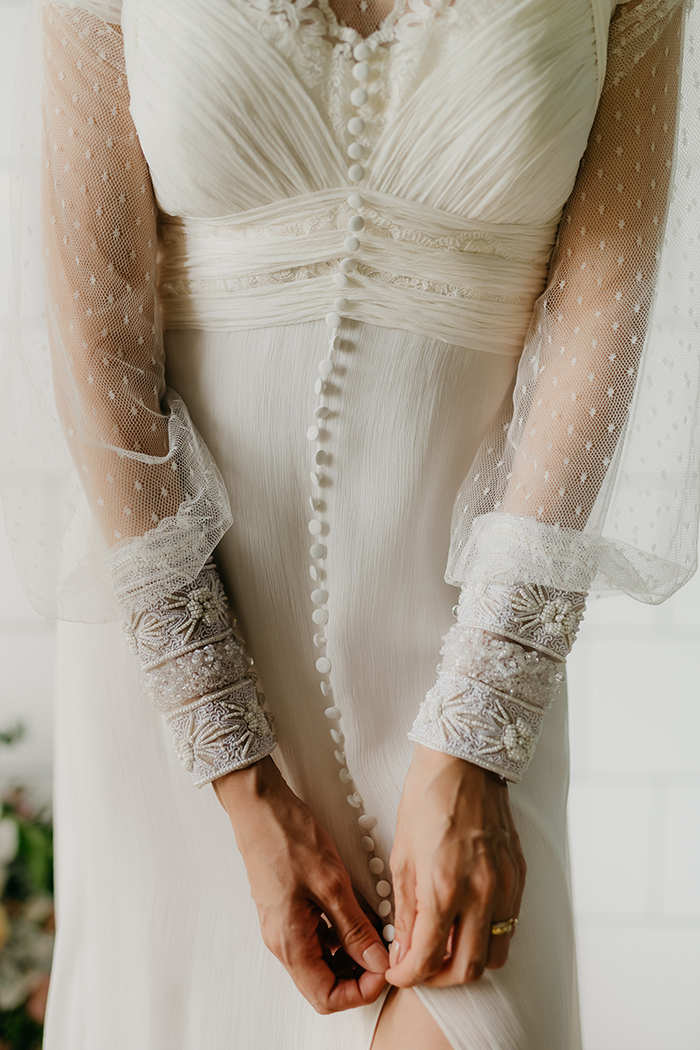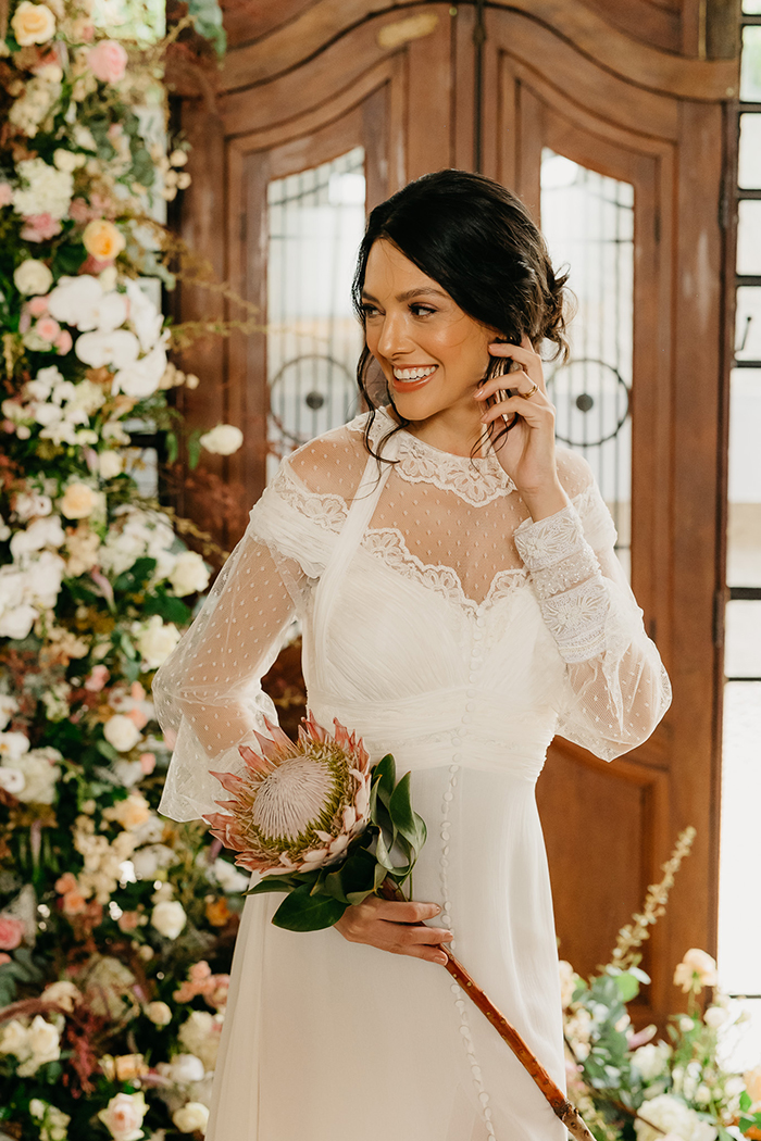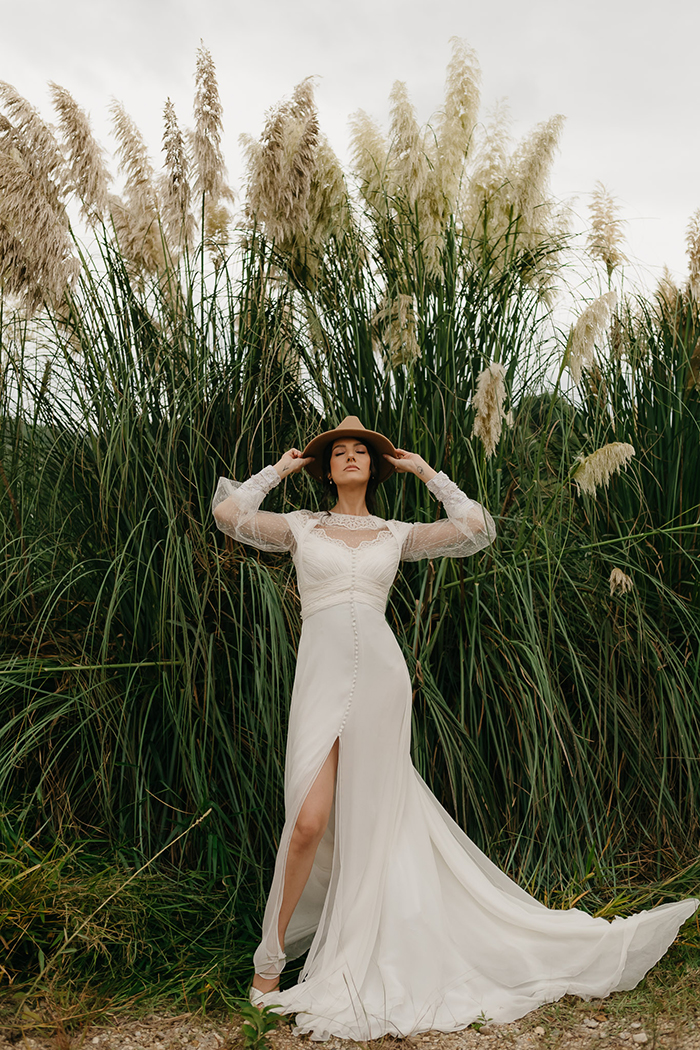O lindo vestido de noiva usado pela Agatha é da Casamarela. É um modelo rico em detalhes, da marca Yolancris, como punhos de renda bordada e renda soutache de seda aplicada no colo.
