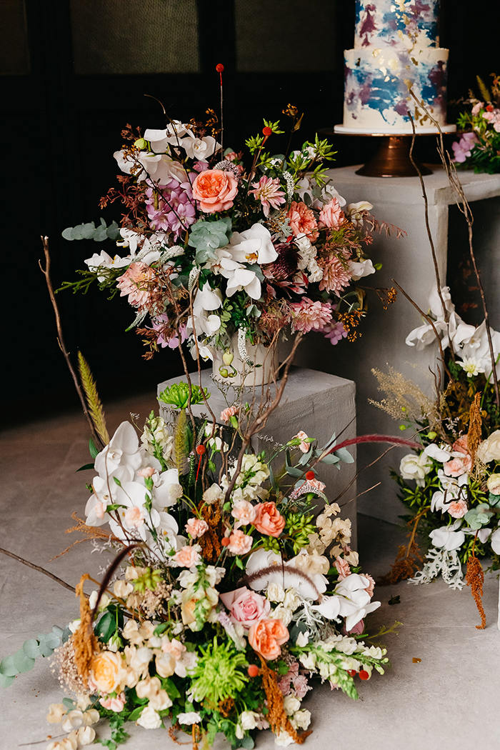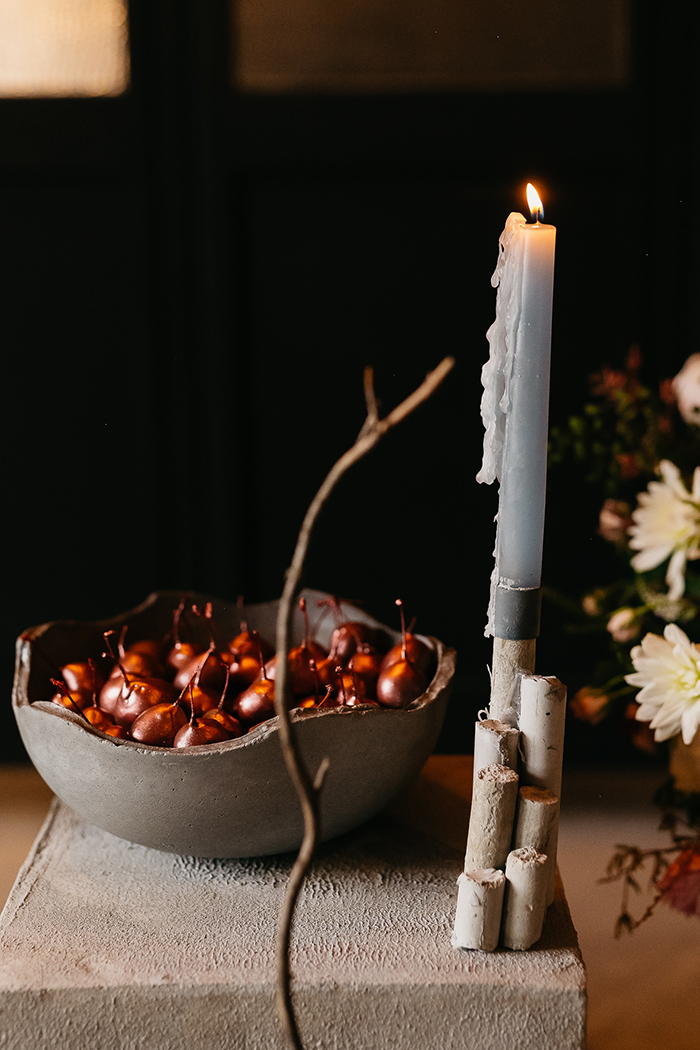 Uma das ideias foi trazer bases únicas para mesa de doces e a mesa do casal, algo singular e cheio de personalidade. Todas as mesas foram projetadas e produzidas de forma artesanal em concreto pela equipe da Núbia Monteiro, e isso foi super desafiador para que alcançassem o resultado esperado. O concreto, além de ser forte, não é perfeito- tem seus defeitos, e essa é a beleza da coisa! Logo na mesa de doces as bases de concreto surgem de um verdadeiro jardim de flores, e assim entendemos o casamento: como a junção de elementos que se completam.