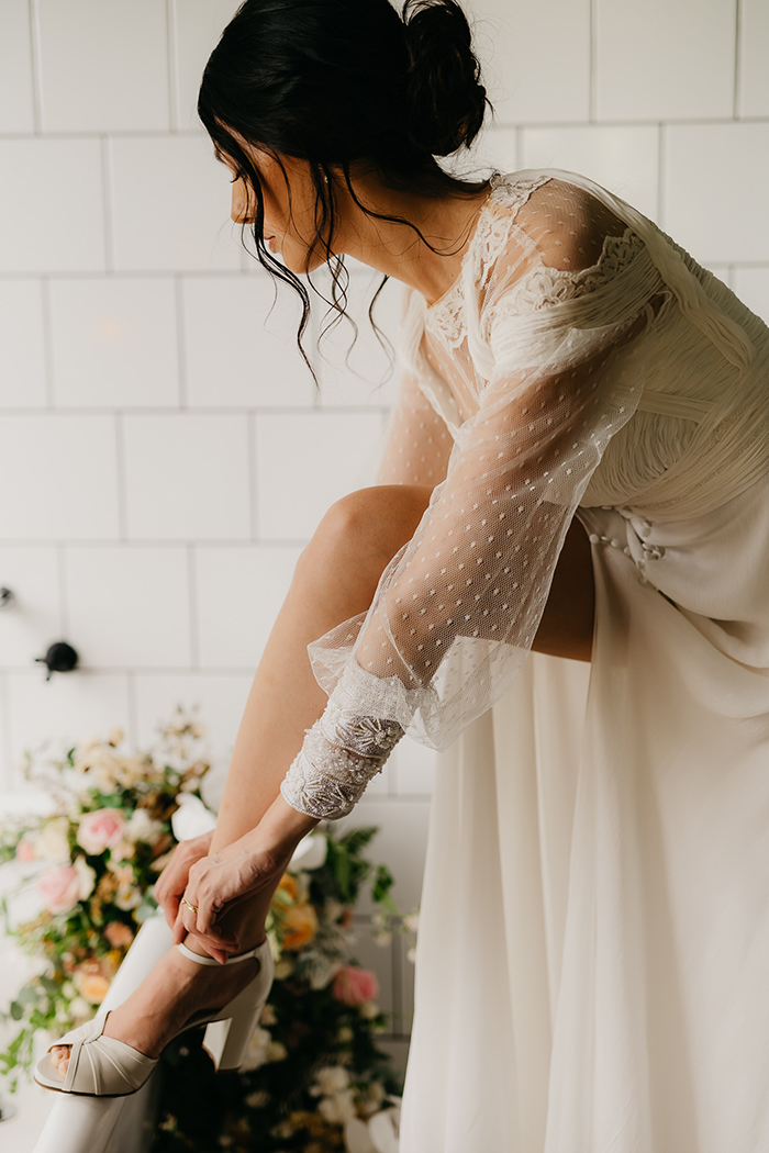 Para complementar o look, a beleza assinada pela Gisele Barbosa foi bem natural e iluminada, com um chignon baixo bem orgânico e com volume, finalizado com acessórios atemporais e delicados em forma de pente da Deda Gianesi e sapato Etiquette.