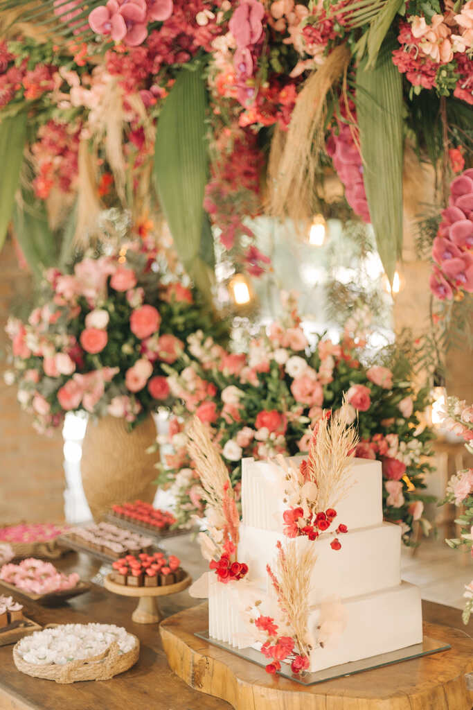 O bolo quadrado deu um toque moderno a composição da mesa.