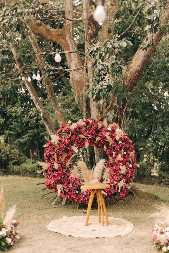 O altar também foi outra surpresa e tanto. Afinal, a combinação impactante de orquídeas pink com a delicadeza do capim dos pampas foi surpreendente.