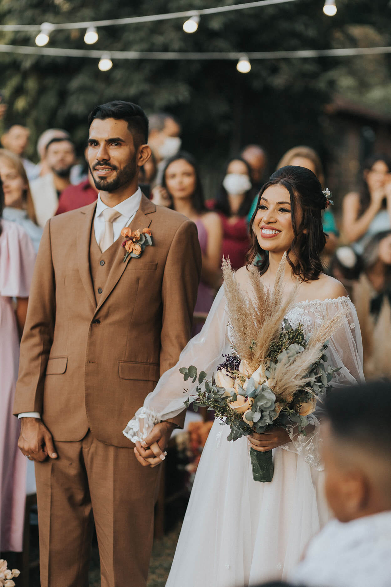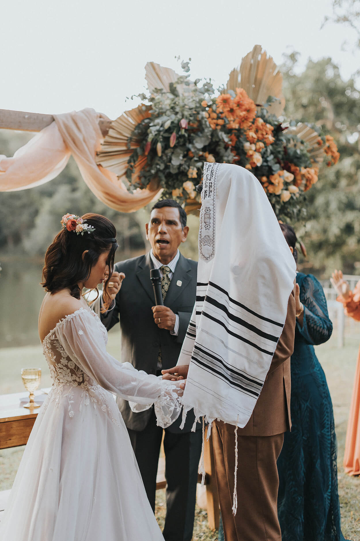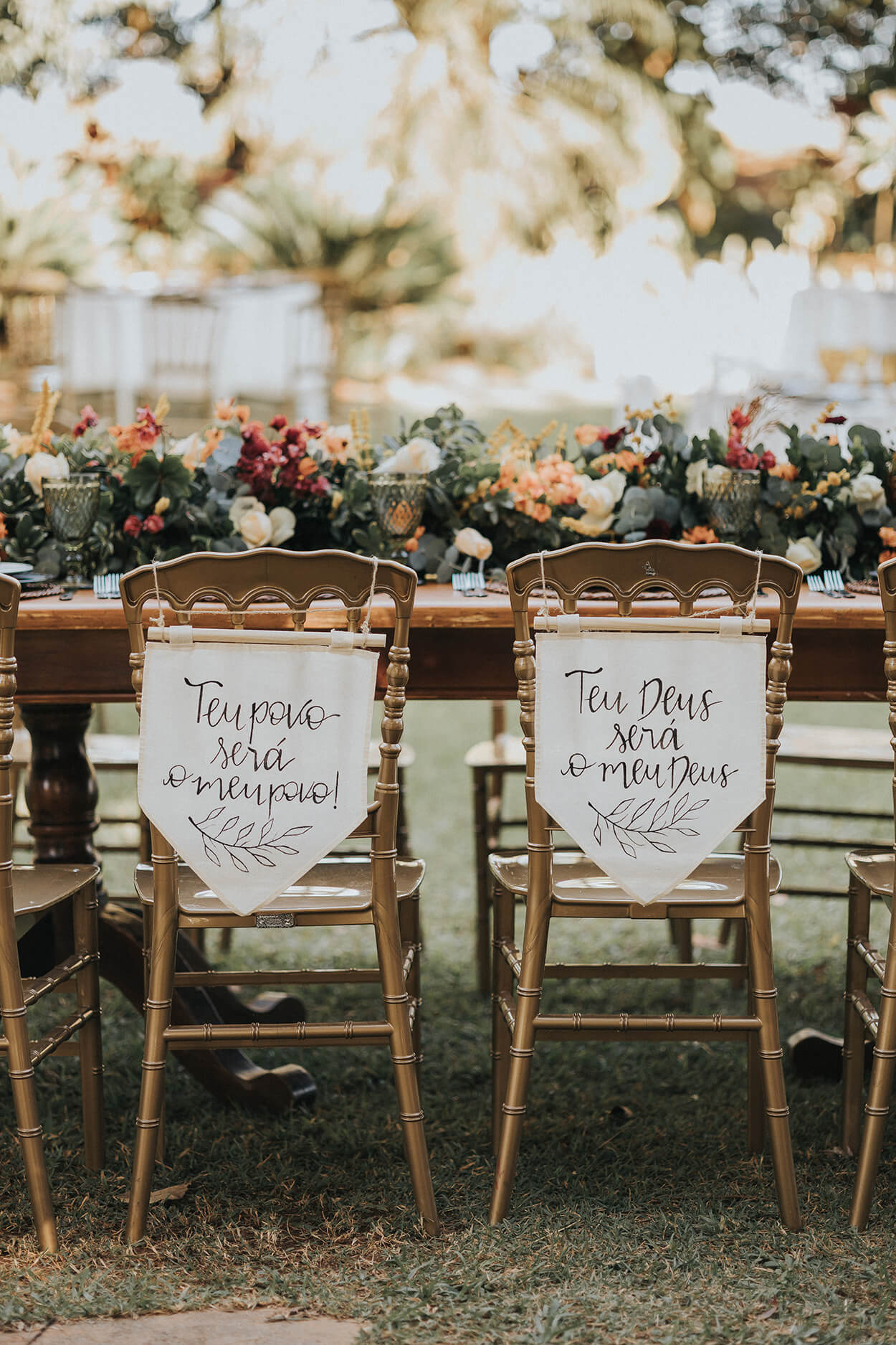 Nem todo casal religioso precisa se casar na igreja. Ambos estavam muito decididos: queriam muito mais do que uma festa bonita. Cada detalhe da decor precisava expressar a sua fé e a gratidão por vivenciar aquele momento. O noivo também foi capturado pelas emoções e depois contou que entrou com a pessoa que ele mais admira no mundo: o seu pai.
