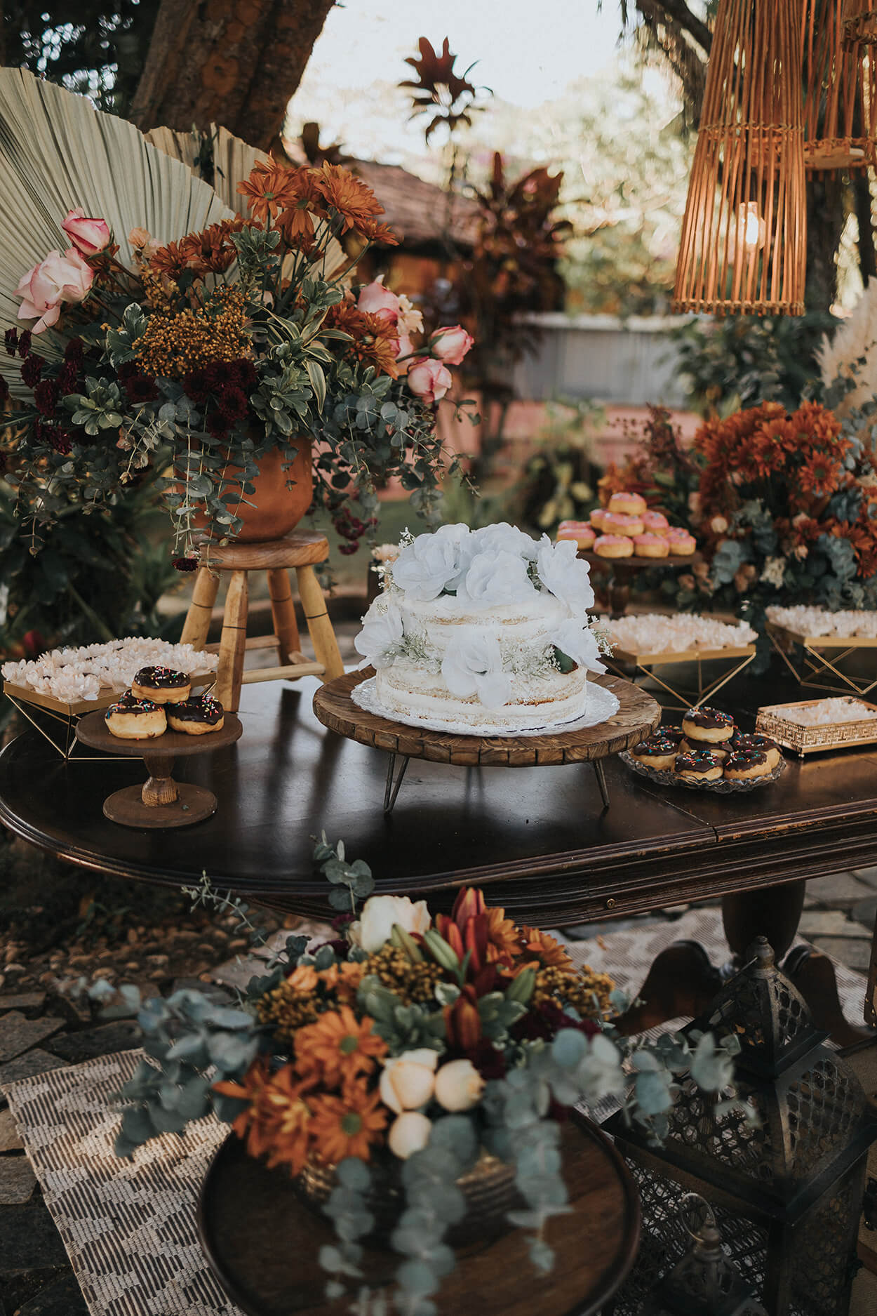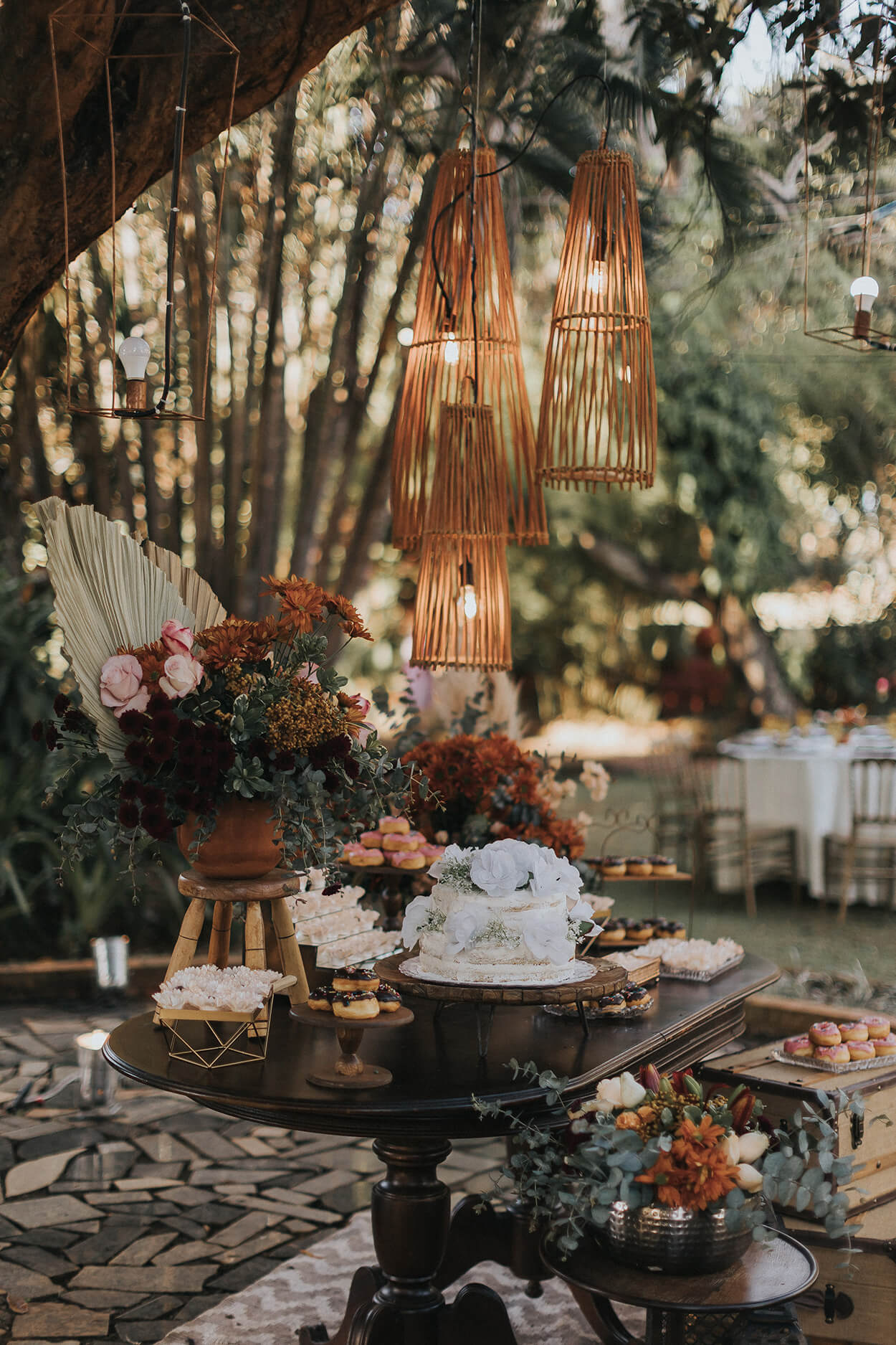 A decoração assinada pela Decorray Rocha entregou toda a beleza que existe nessa época mais fria do ano! A paleta contou com muito terracota e laranja queimado. E ainda sobrou um espacinho para combinar as flores mais escuras para “aquecer” o ambiente. O estilo chic também deu uma passadinha aqui e deixou alguns detalhes em dourado.