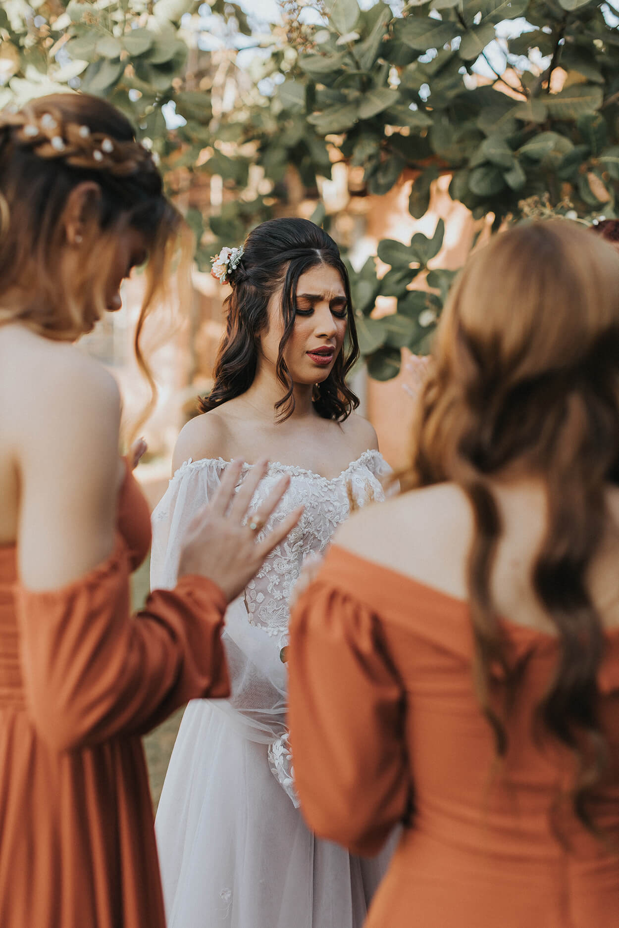 A Mara encarou um first look com buquê, com as madrinhas e ainda teve um first touch com o noivo. E depois de tudo isso ainda está linda e maravilhosa para caminhar até o altar.