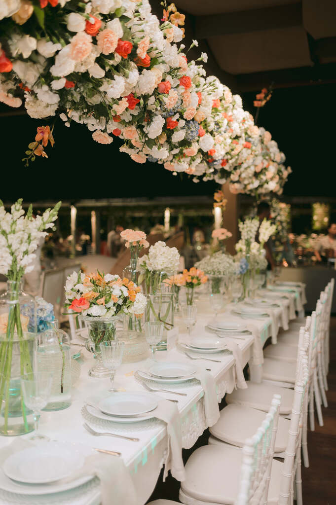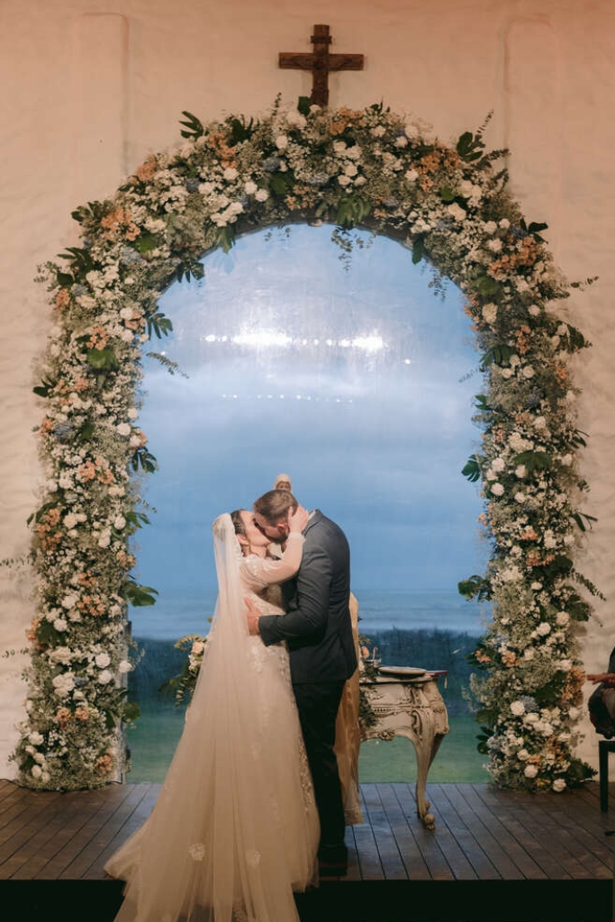 “Apesar do nosso casamento ter acontecido na praia, não desejava uma pegada tropical na decoração. Pois o lugar por si só já tem os elementos desse estilo: folhagens, coqueiros, frutas.