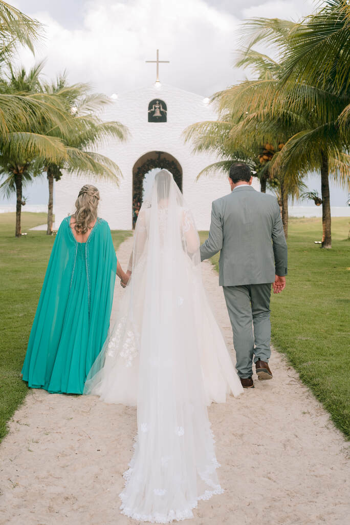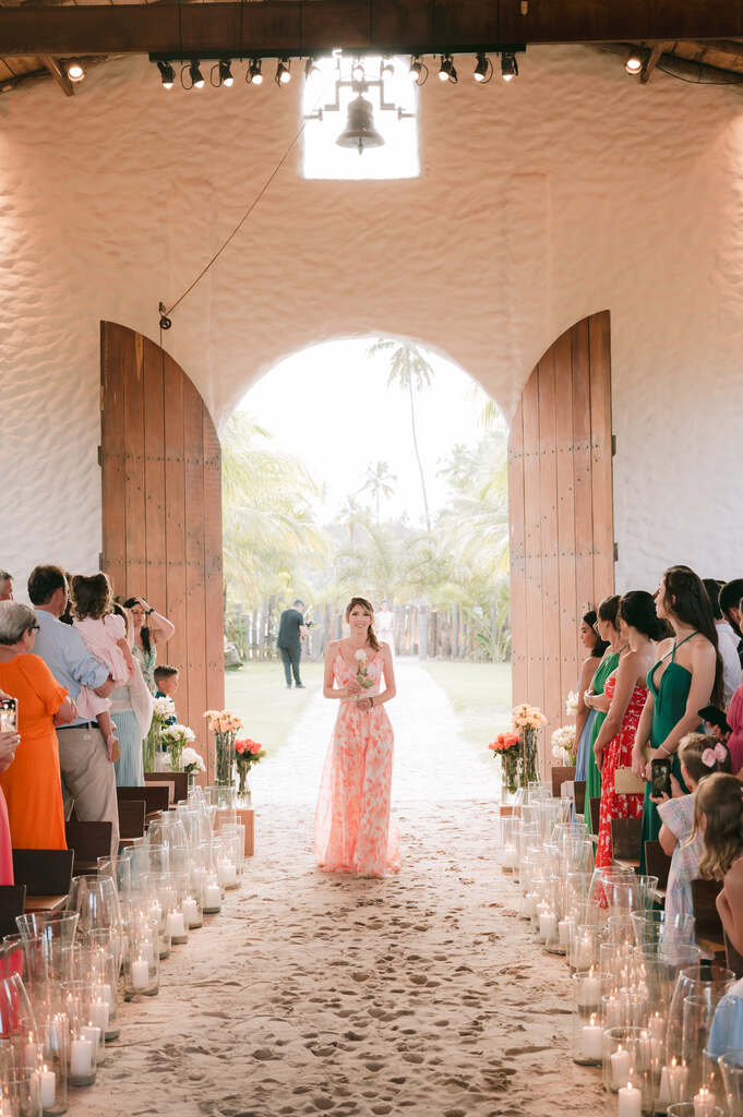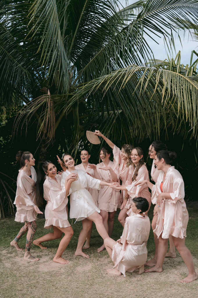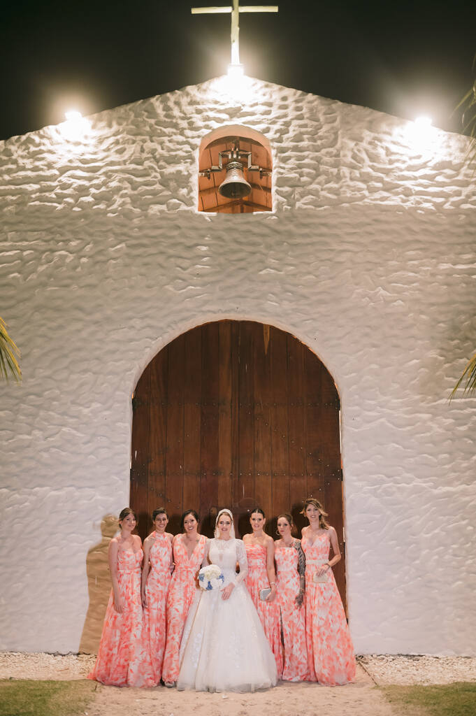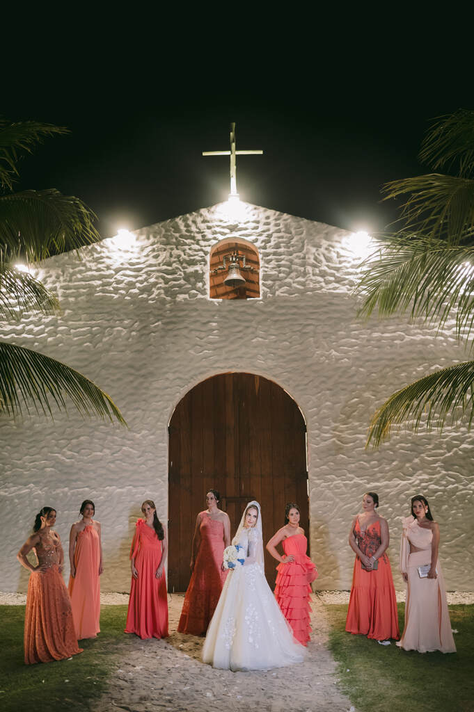 “Ao todo, foram 8 casais de padrinhos e 6 damas de honra. A cor para as madrinhas foi o salmão/pêssego (peach fuzz, a cor de 2024).