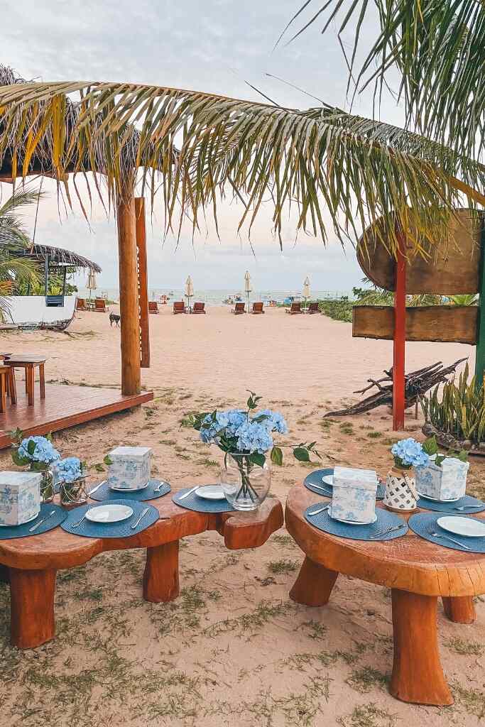 Ou seja, hortênsias e rosas, além de cravos e galhos de eucalipto, abraçando as texturas naturais, como a areia do local, itens de palha, rattan e etc.”