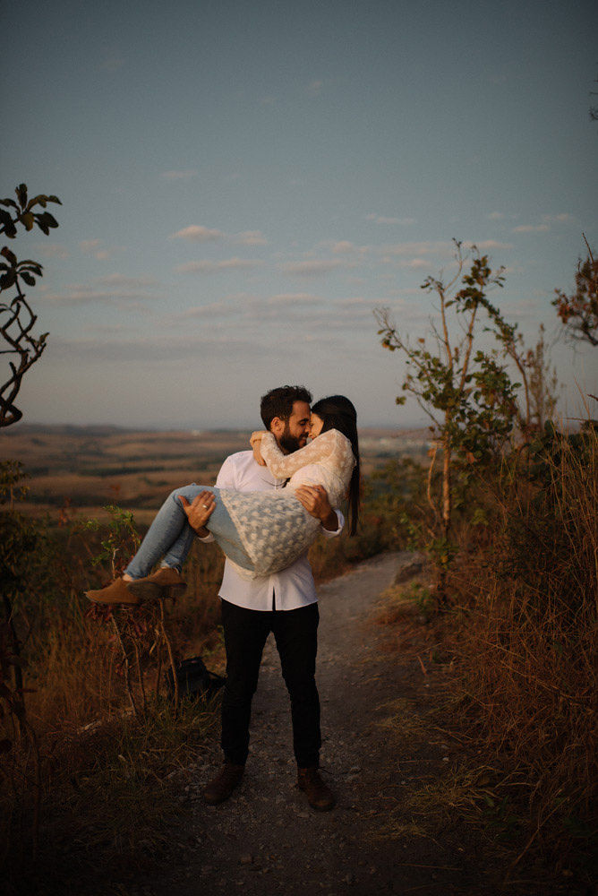 “…Eu tremia de felicidade, eu estava muito ansioso! Aí eu a vi, a 50 metros de distância. Ela vinha chorando, e aquele caminho era lindo, foi um dos momentos de mais brilho e vida na minha vida!! Ela chega, mostro que é o momento de continuarmos juntos a subida daquela montanha, a caminhada da vida. Quando chegamos lá em cima olhávamos ofegantes um para outro, para a montanha que tínhamos subido, a natureza, nossa família, amigos…. meus olhos brilhavam de amor e felicidade pela Marcela, pela oportunidade de ali estar com ela, por termos nossa vida sendo guiada por Deus. Ali virou um marco para todo sempre em nossas vidas, experimentamos uma felicidade única. Eu parecia que flutuava de amor, em gratidão a Deus por ela, então… A pedi para casar comigo!”