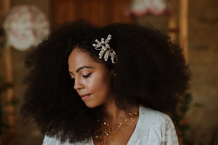 Noiva com cabelo solto afro e presilha