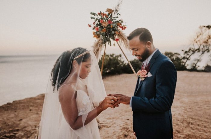 Noivos trocando alianças em casamento na praia