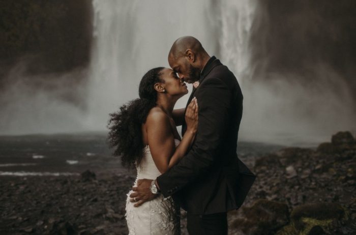 Noivos abraçados perto da cachoeira