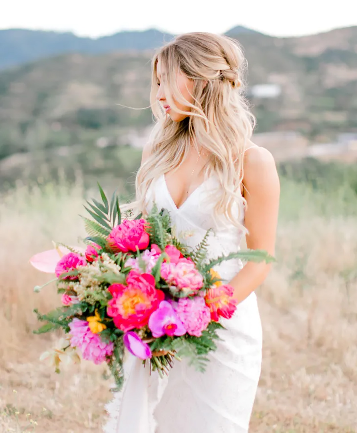 A vibe da cerimônia no campo é mais próxima a natureza, bem relax e descontraída. Geralmente, as noivas optam por vestidos fluidos e leves, com ar romântico. Então, para combinar com esse clima, prefira um cabelo mais orgânico e com acessórios leves.