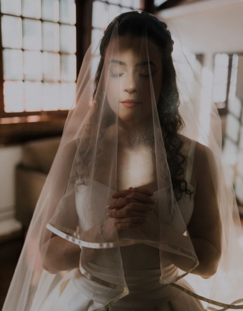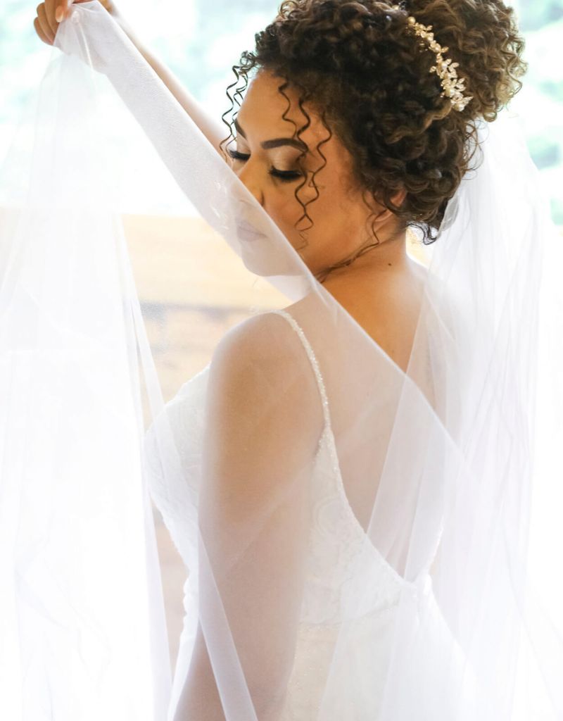 O véu de noiva e coque formam a dupla perfeita! O coque alto com um véu preso passa um visual atemporal, assim como o coque baixo, que é um clássico encantador.