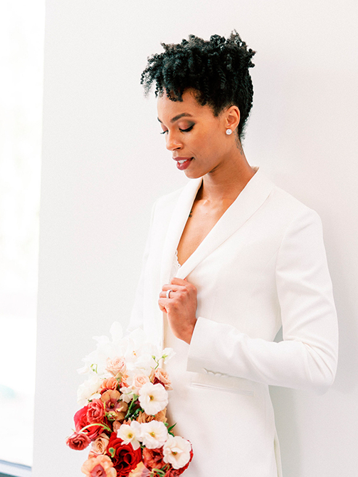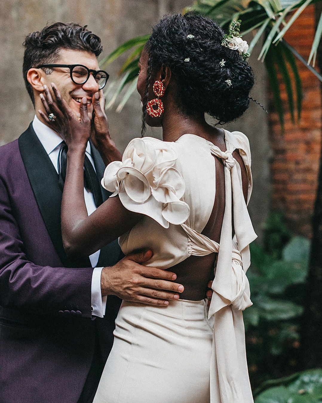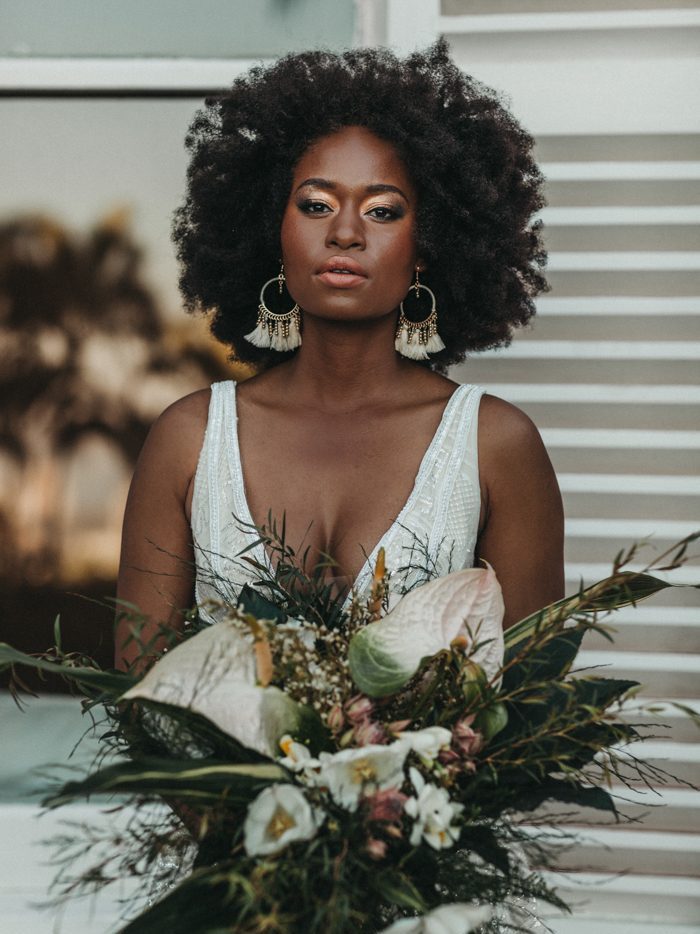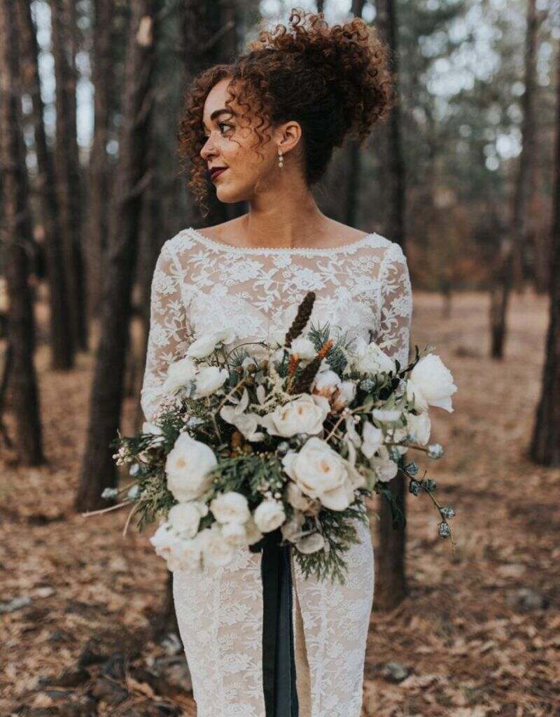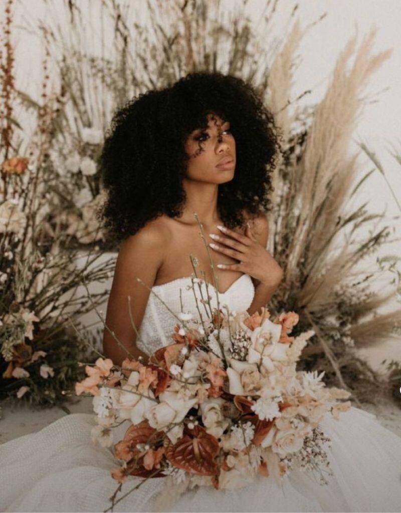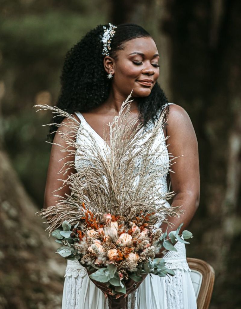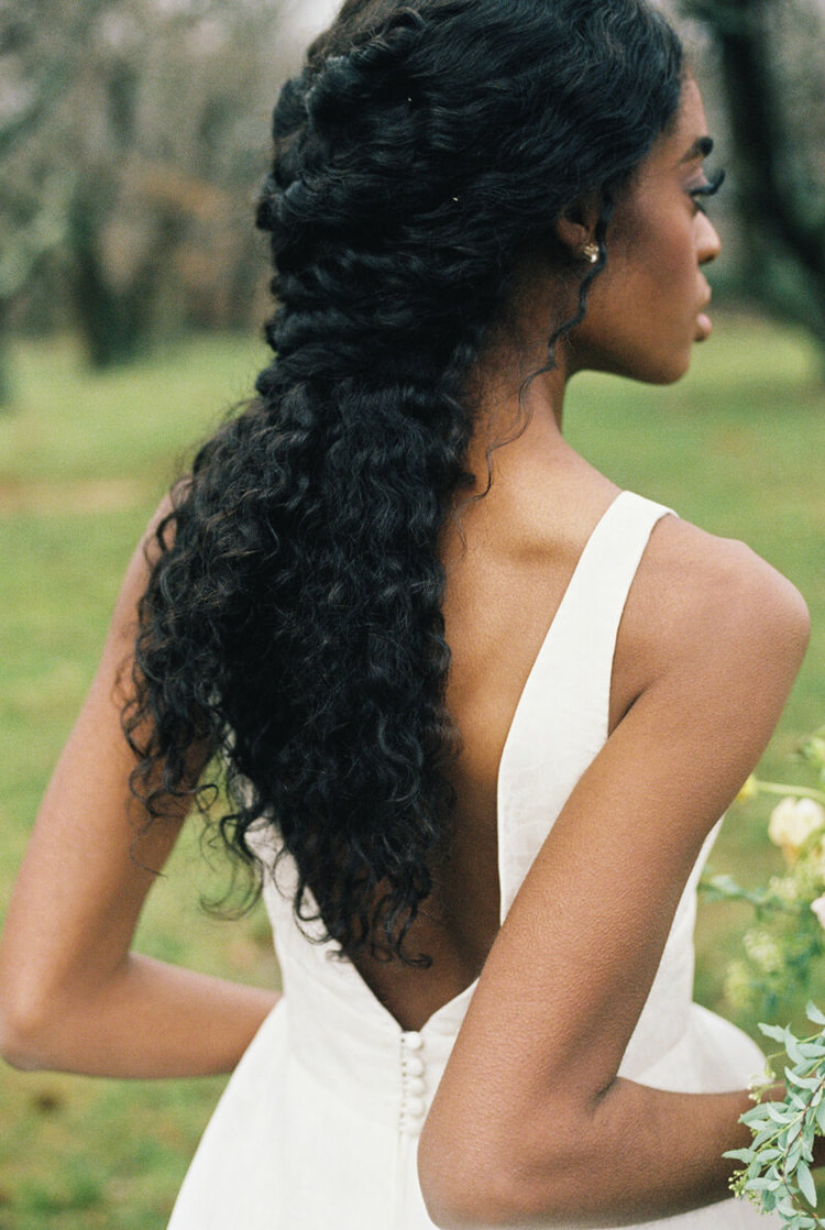 No casamento civil, penteados para cabelos cacheados podem seguir uma vibe mais natural, com fios soltos ou semi preso.