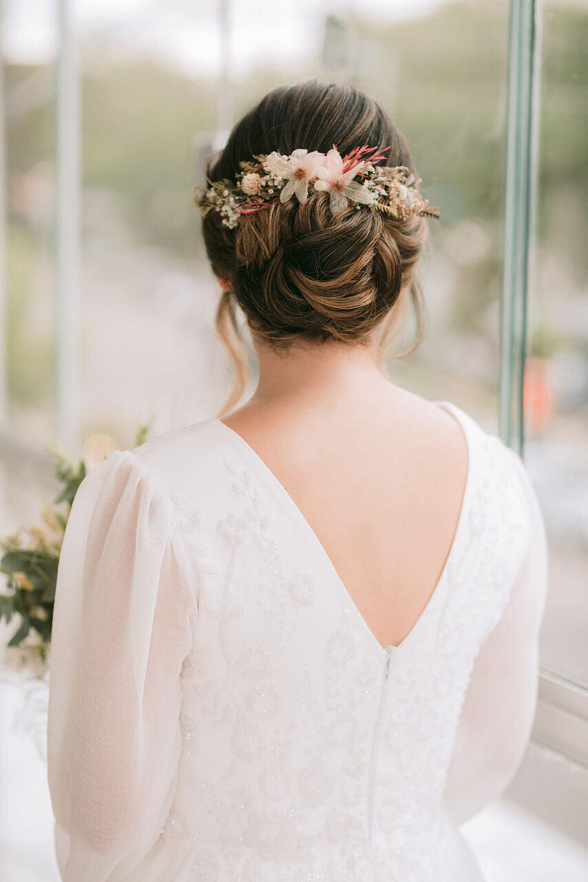 E por fim, os longos abrem diversas possibilidades para penteados mais estruturados e sofisticados. No entanto, é importante considerar a quantidade de cabelo ao escolher o estilo, pois penteados mais elaborados e mais presos, podem não se manter no lugar durante todo o evento, especialmente devido ao peso dos fios.