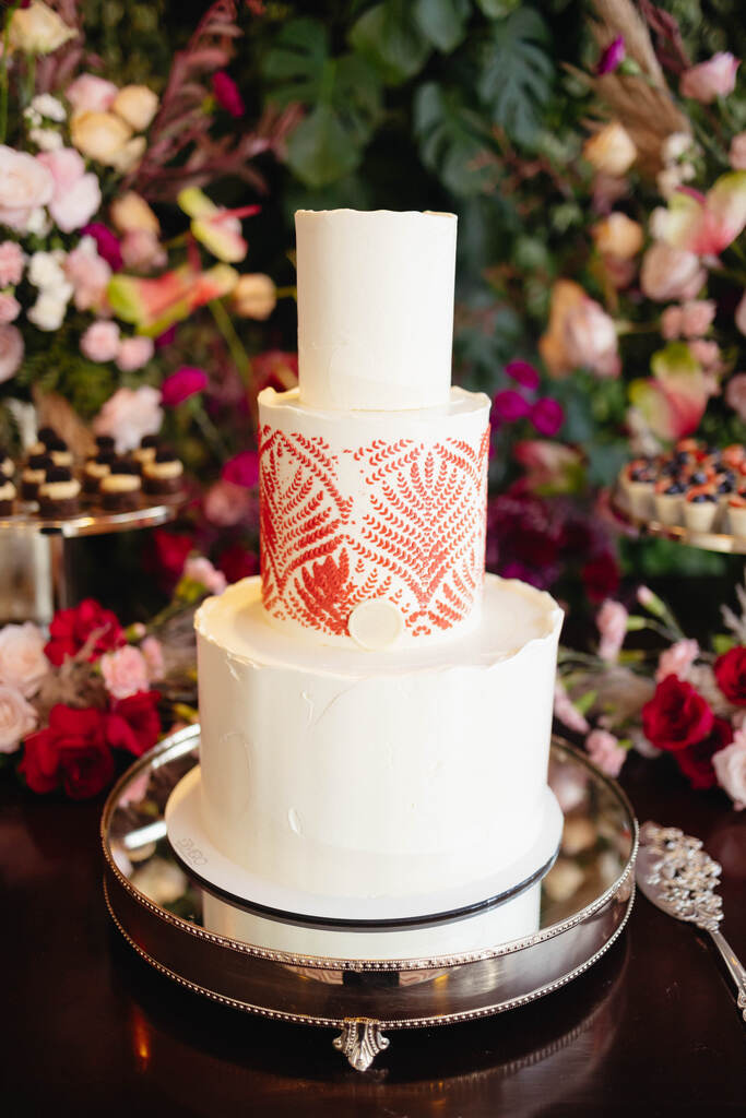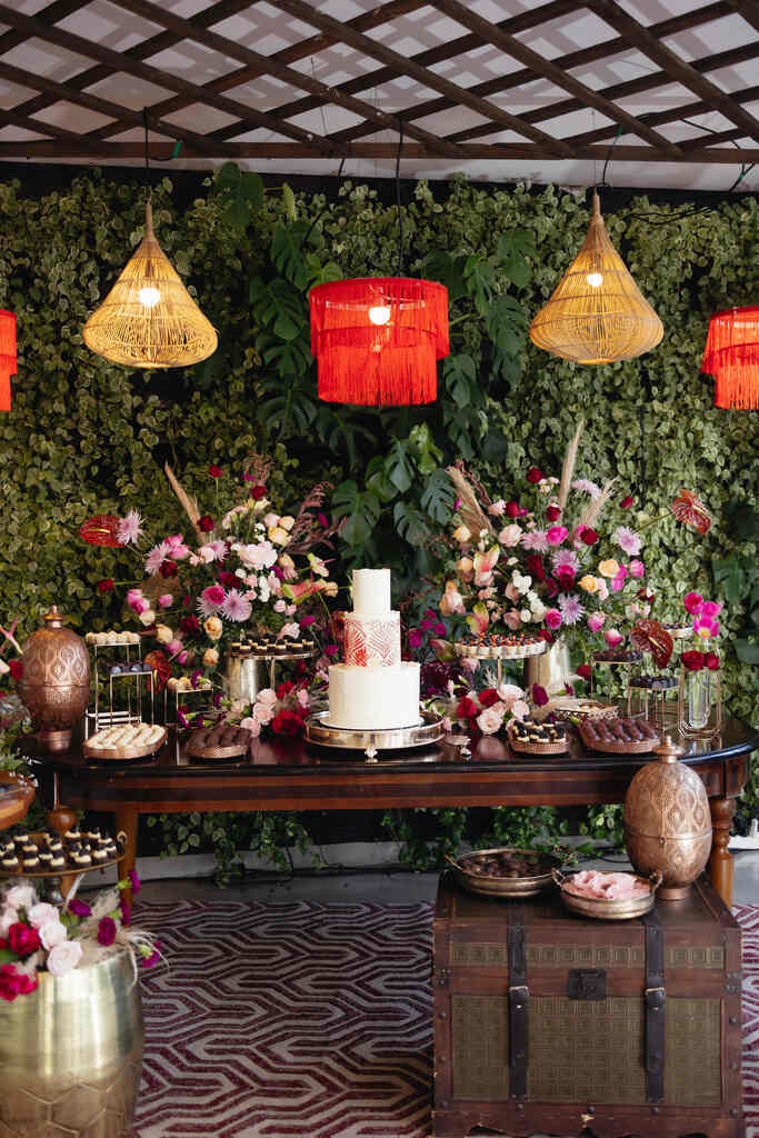 Sobre os diys, a minha decoradora fez as luminárias vermelhas de franja da mesa do bolo.