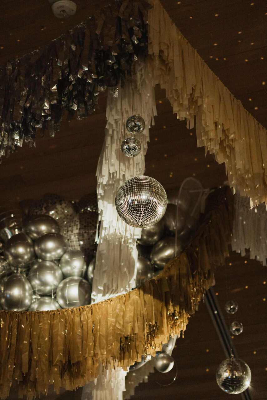 Pendurar elementos que combinem com o estilo do casamento, como balões, flores ou luzes sobre a pista dá um toque especial. Cordões de luz são perfeitos para casamentos ao ar livre ou locais rústicos, enquanto refletores coloridos e globos espelhados trazem um visual mais glamouroso.