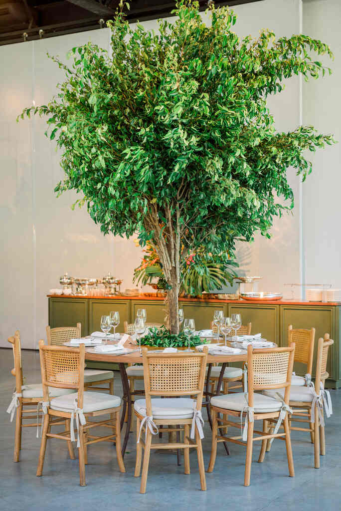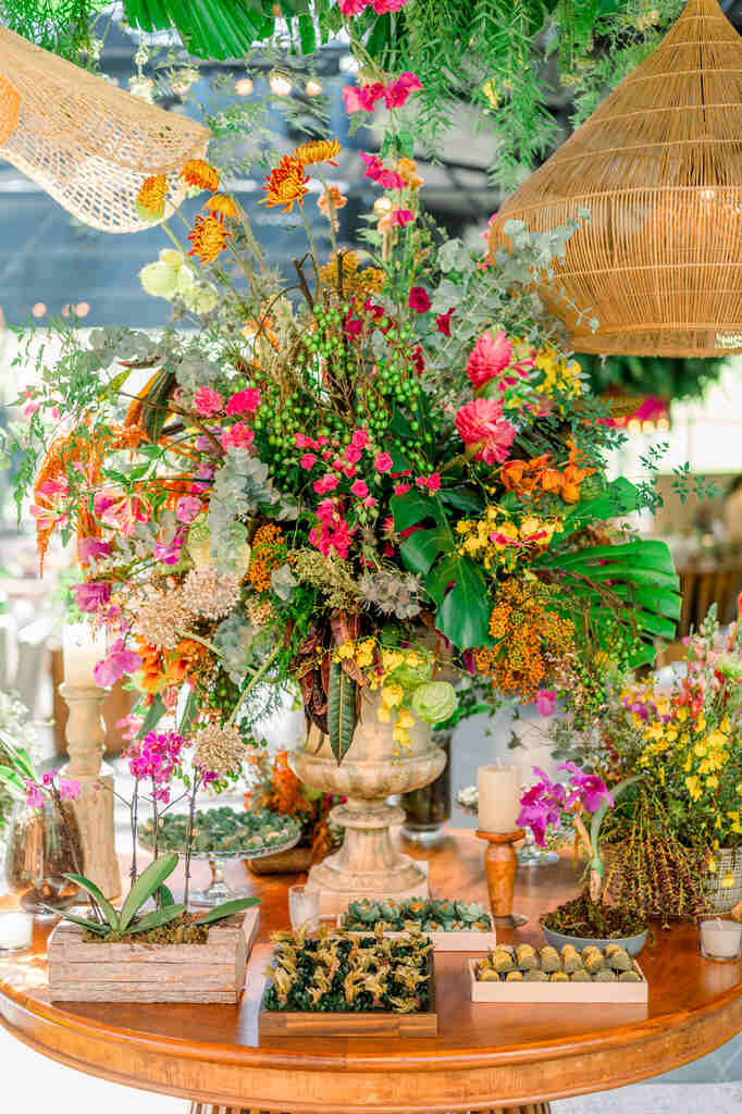 “Nós amamos praia, então quisemos levar a praia para o campo. Colocando cores vibrantes na decoração, itens de palha, água de coco na recepção da cerimônia, um cardápio fresco e drinks refrescantes.