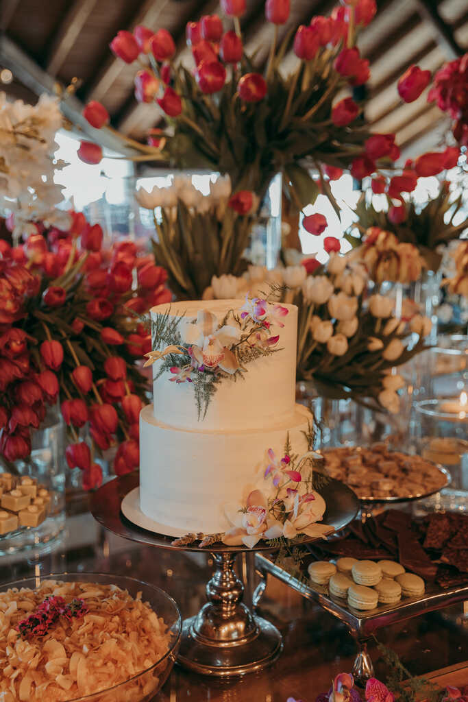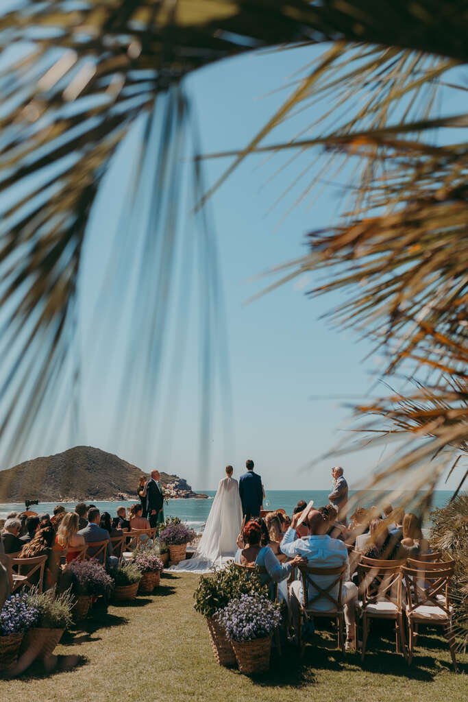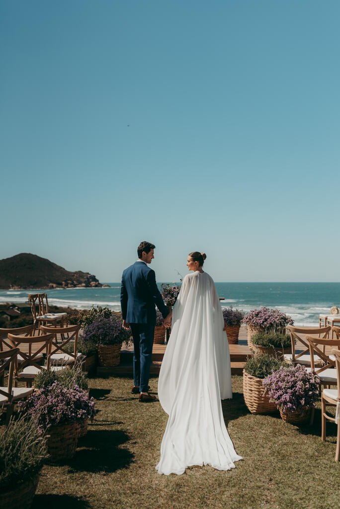 Para começar, a decoração se destacou graças ao frescor das flores em todos os cenários, e ainda inovou ao não colocar um arco de flores no altar, evidenciando ainda mais o caminho da noiva e a paisagem maravilhosa.