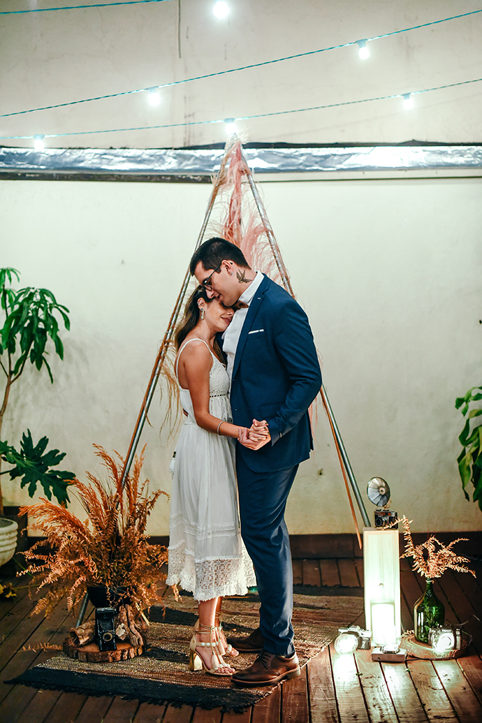 Nem dá para acreditar que já faz um ano que este casal descontraído e apaixonado disse SIM! Para celebrar as bodas de papel, resolveram fazer uma renovação de votos em casa – afinal não dá para sair no meio da pandemia, né? – A decoração foi feita com elementos que já tinham em casa. Também reaproveitaram alguns itens da decoração do casamento, se vestiram e pronto! Não precisa muito para reviver as emoções de estarem juntos.