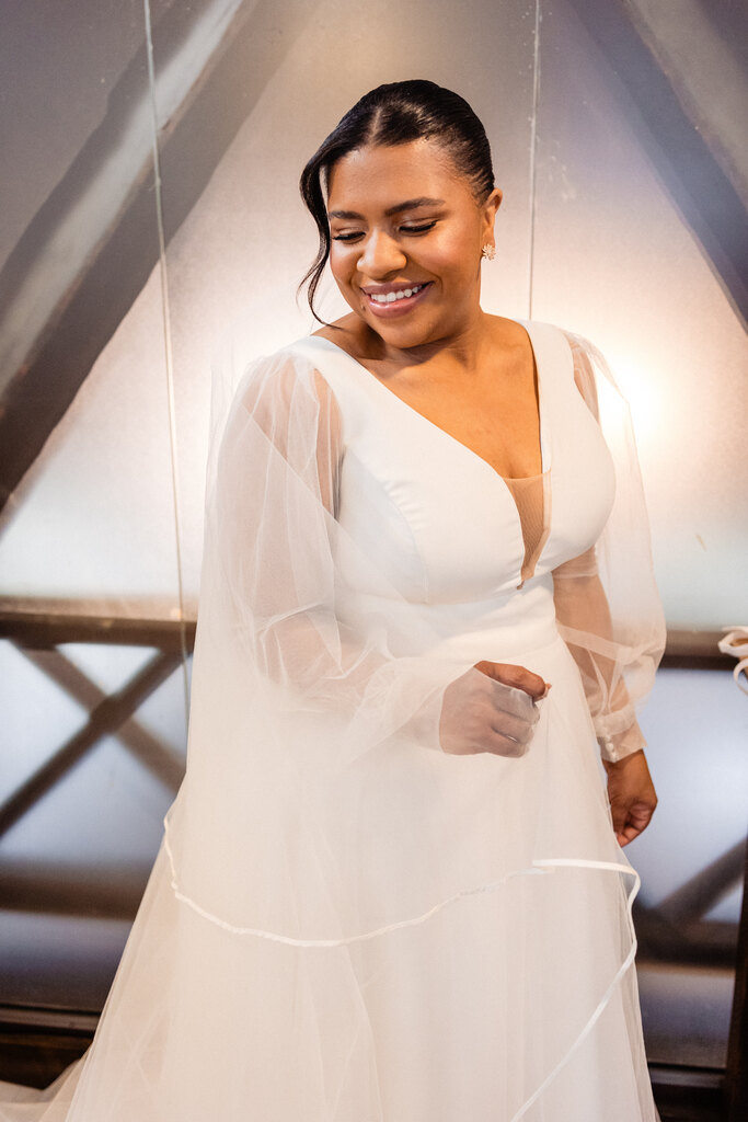 A Cris escolheu um modelo minimalista e atemporal, com saia volumosa, cauda longa e mangas levemente bufantes.