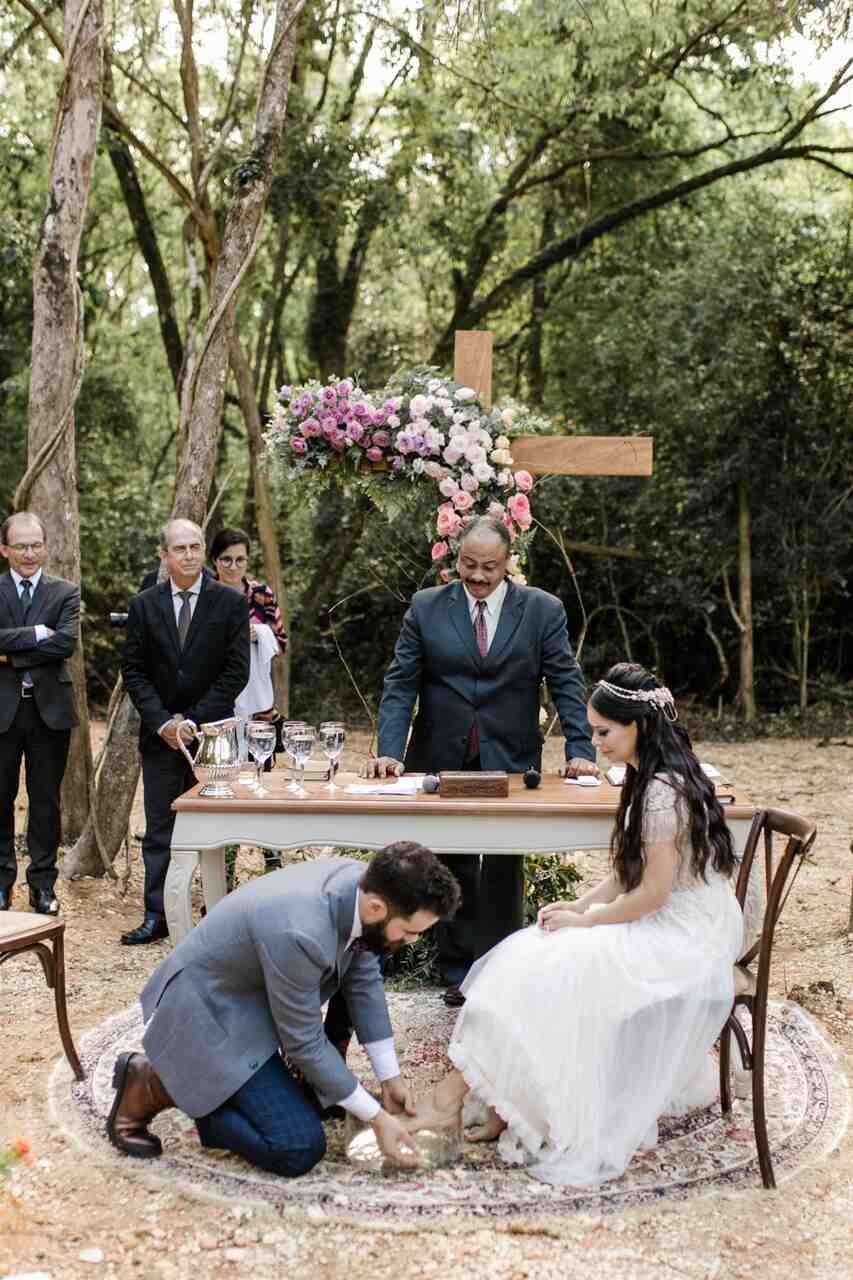 Normalmente, o roteiro de um casamento evangélico inclui orações, cânticos, leituras bíblicas, mensagem conduzida pelo pastor e rituais, como o lava-pés, por exemplo.