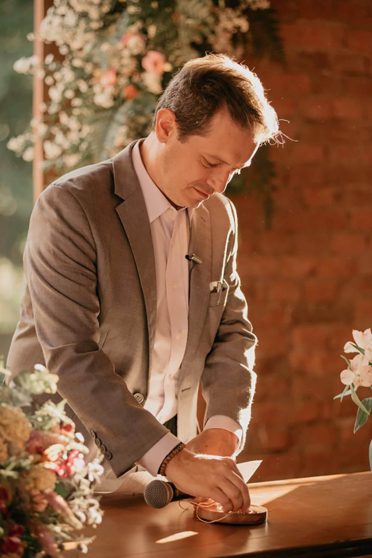 A escolha do local da cerimônia deve ser um dos primeiros detalhes acertados, afinal, é a partir dele que pensamos a decoração e disposição do mobililário. A maior prova disso é o altar, mesmo simples, ele ficou apaixonante somente emoldurado com as flores e com a luz natural.
