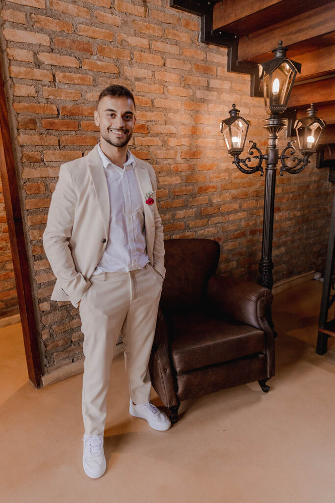 entrada do noivo com terno off white ao lado de mãe com vetsido marsala com decote em v