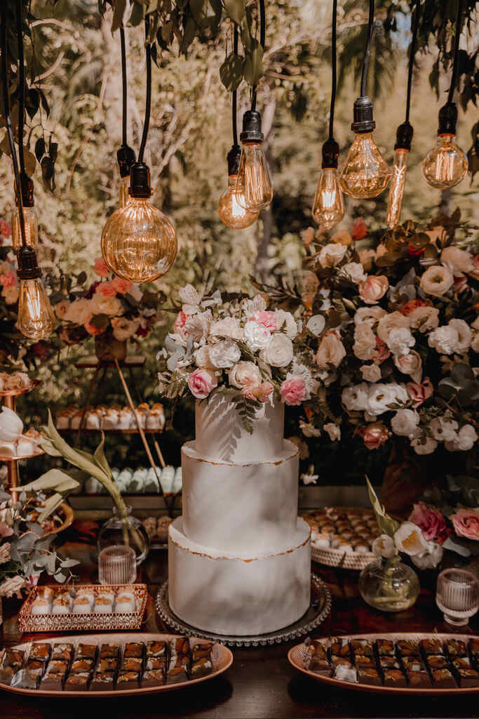 mesa de madeira com bolo de casameto ao lado de vasos com flores brancas e rosas e luminárias pendentes