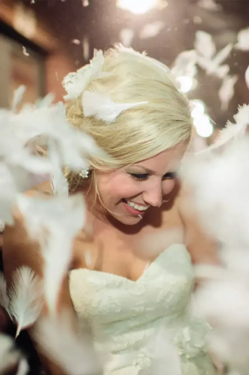 As penas conseguem dar um efeito suave e muito bonito para a saída dos noivos. Como são leves, demoram a cair no chão e vão garantir uma foto incrível para o seu álbum.