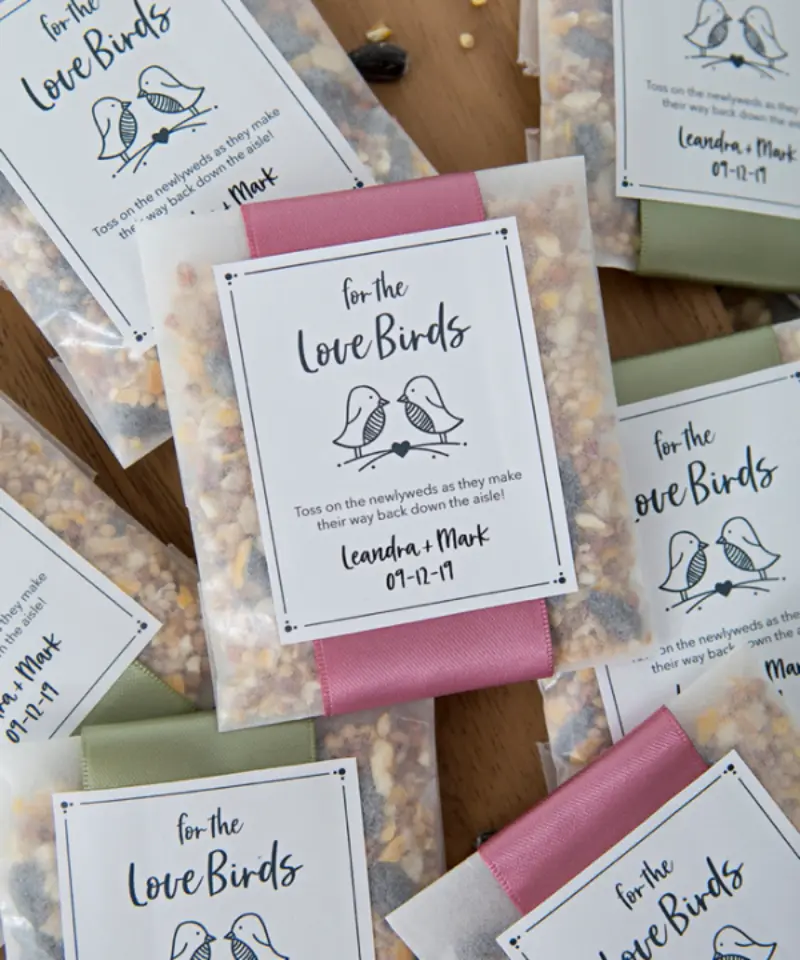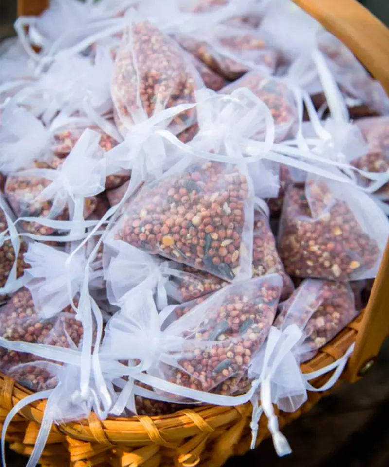 Uma sugestão perfeita para os noivos que buscam um casamento sustentável são as sementes para passarinhos. Durante a saída dos noivos elas vão garantir um efeito similar ao do arroz, porém após o casamento, servirão de alimento para os passarinhos do local. É uma ideia perfeita para casamento ao ar livre no campo, por exemplo.