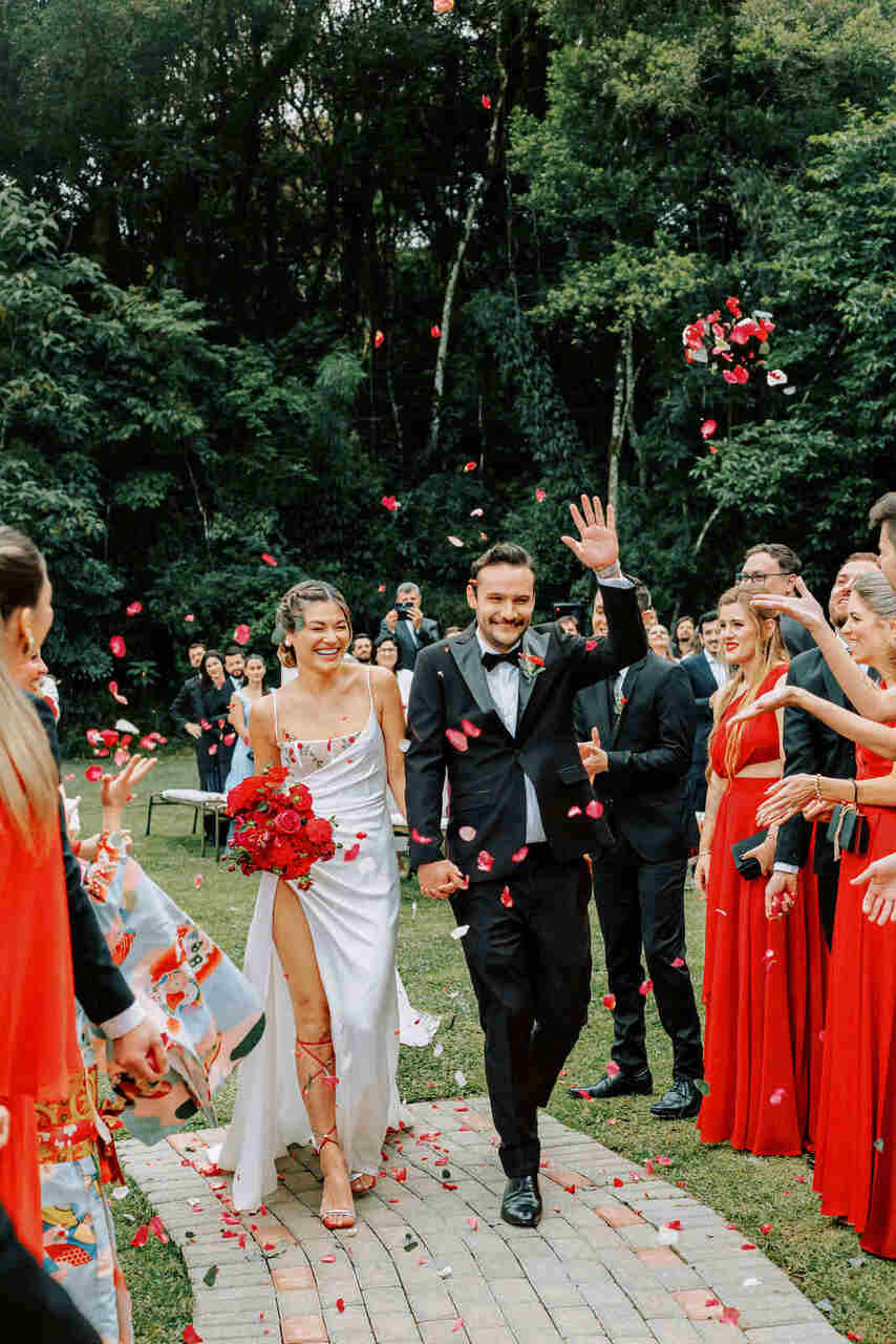 O vermelho não é a cor mais popular, mas fica ótimo na decoração, buquê ou até mesmo no vestido de noiva para criar um contraste.