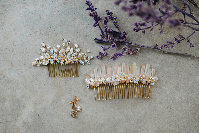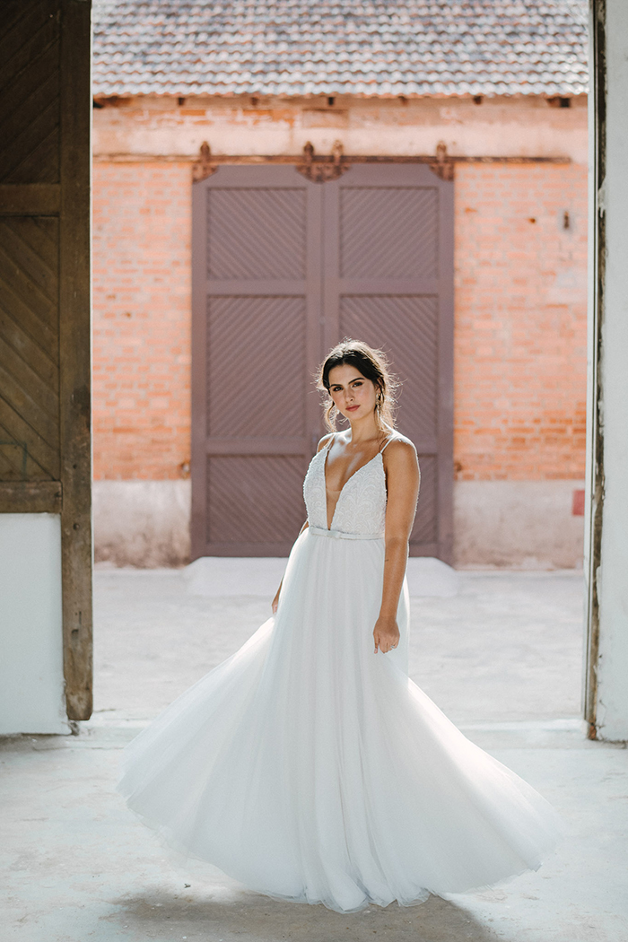 O segundo look, um vestido com bordados no corpete e saia volumosa, era romântico e delicado, perfeito para um casamento no jardim. Para a beleza, a Camila White fez um chignon baixo com pente de flores douradas e pérolas do Atelier Serenité.