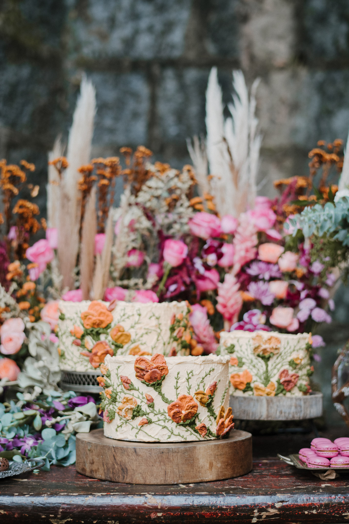 Nossa mesa de bolo e doces foi montada ao ar livre, afinal, nada mais gostoso do que uma tarde no jardim para celebrar. O trio de bolos com motivo de flores da Roberta Knudsen e os docinhos da Mélie Douce estavam em completa harmonia com os arranjos florais. Sabe quando a mesa parece um diorama de floresta de conto de fadas? Tinha até pirulitos com pétalas de flores comestíveis da Adocique para deixar o ambiente mais lúdico e mágico.