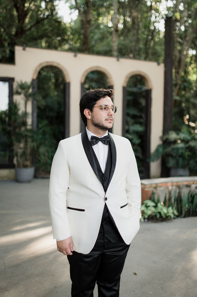 Noivo de smoking branco, pula-pula e brownie na Casa Giardino