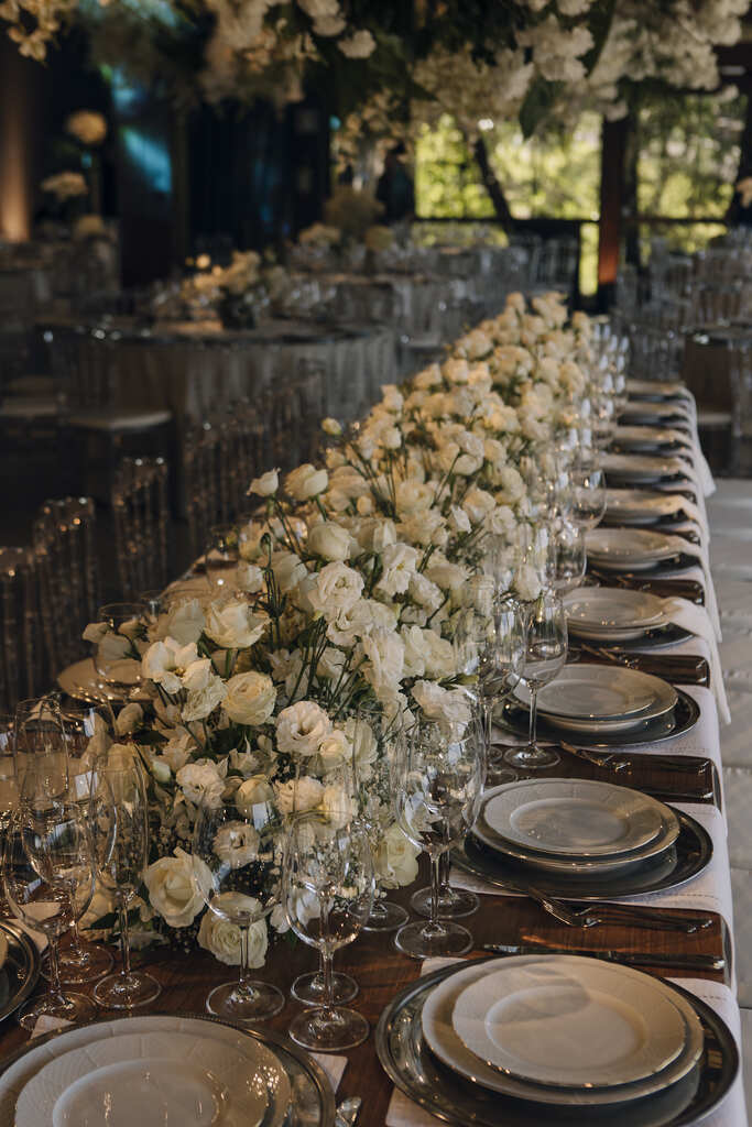 A escolha dos arranjos florais e da paleta branca e verde revelam de onde veio a inspiração: do estilo clássico.