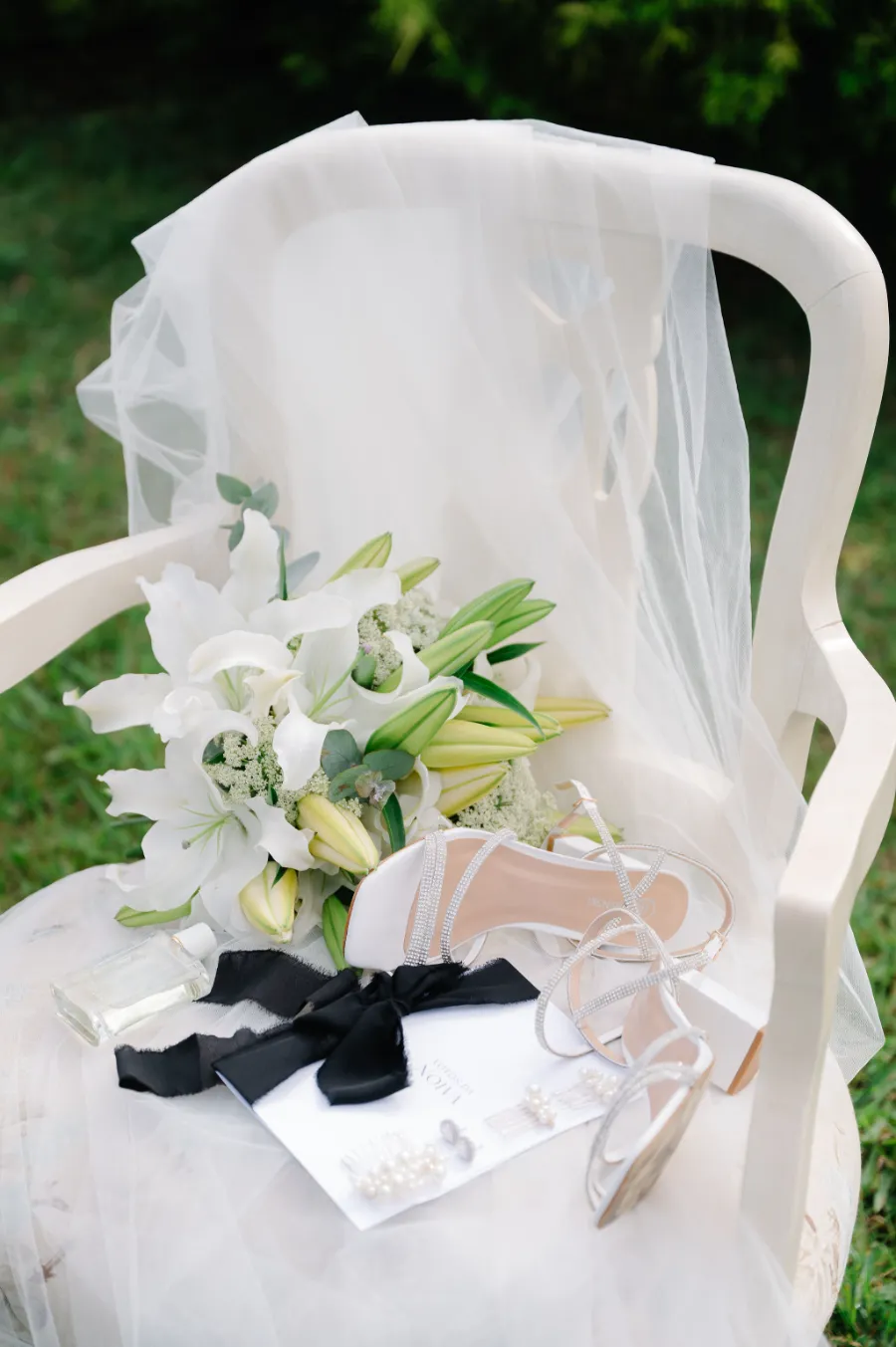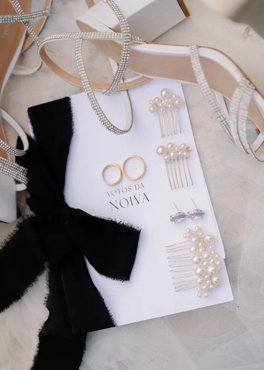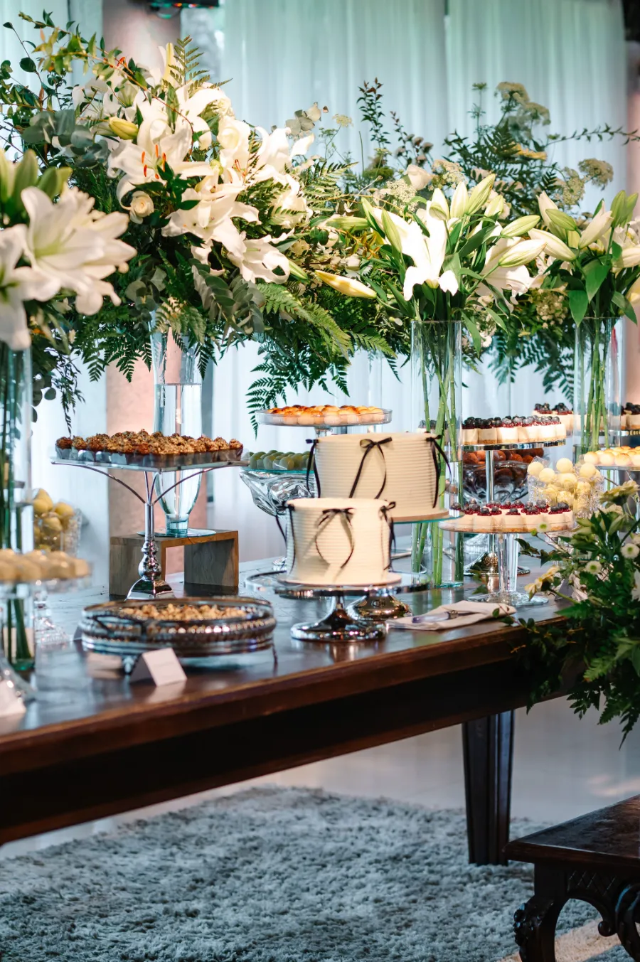 “Escolhemos a paleta branca com folhagens e detalhes com laços pretos…