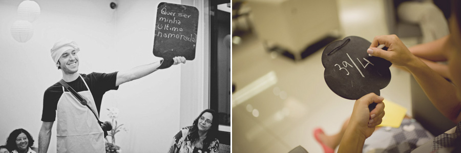uma das brincadeiras que fizemos foi com a lousa. eles contavam a história de amor e nesse ínterim os convidados apontavam o quadrinho negro com alguma palavra que deveria entrar na história. essa brincadeira fica legal com objetos também, como eu fiz no meu chá bar.
